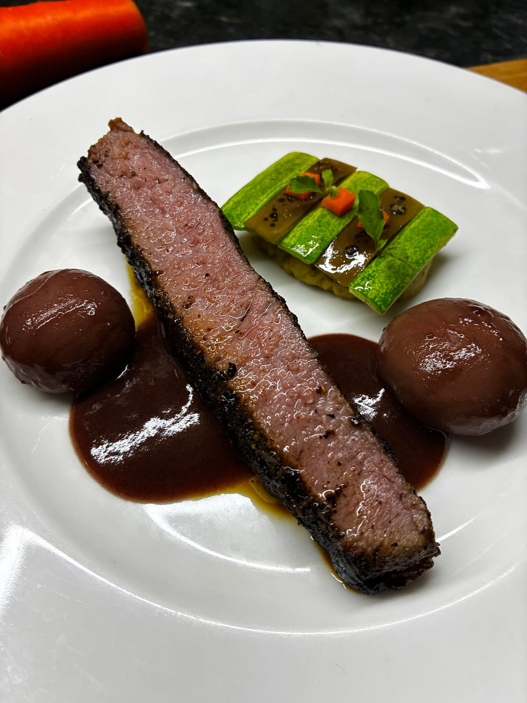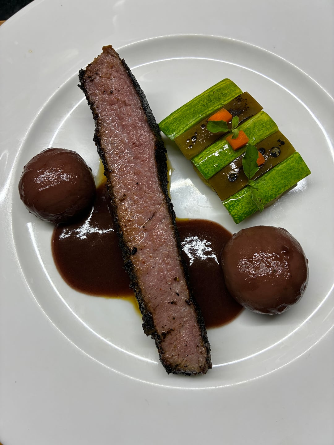 Sirloin, red wine soaked mushrooms, red wine glaze, cucumber-eggplant on truffle purée