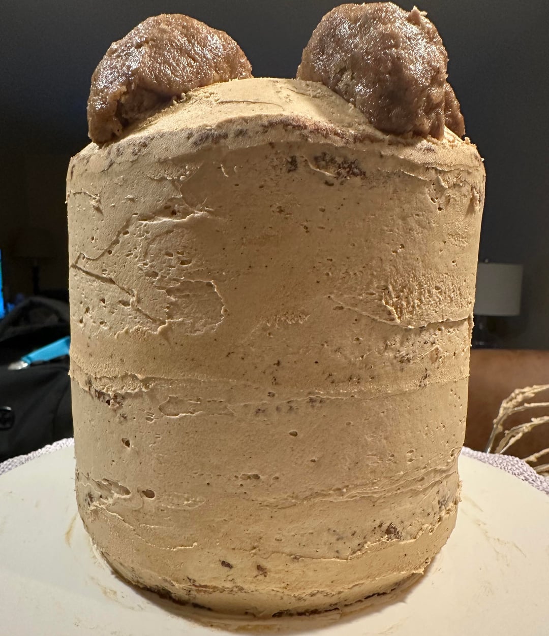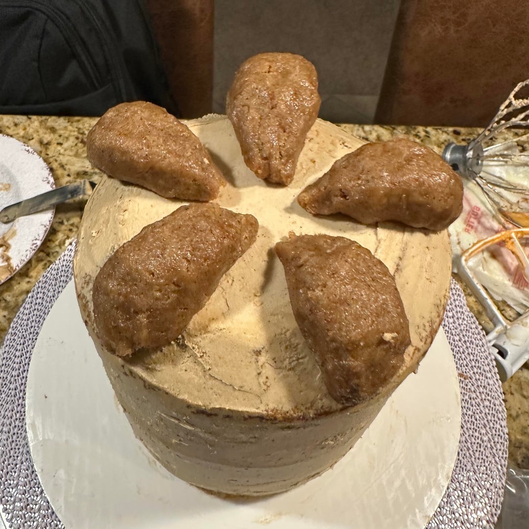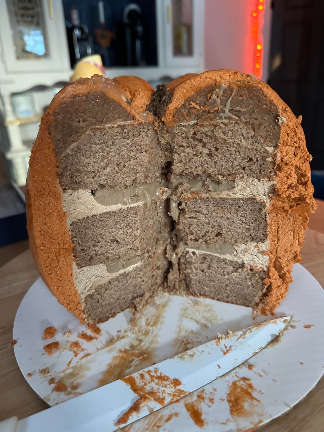 Dirty chai cake! I cut off the edges of the cake, then mushed those pieces together and used the “cake pop” mixture to start the ridges of my pumpkin.