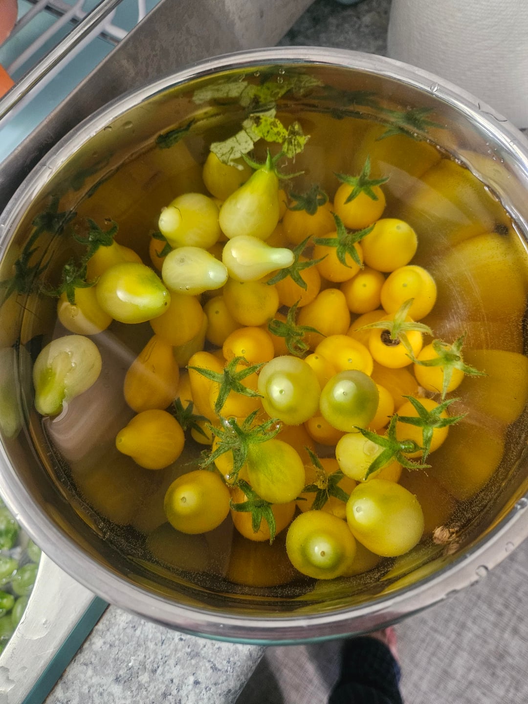 I see you’re also overrun by yellow pear tomatoes. I have a stupid amount from literally one plant (~250-400 yellow pears per week). The vines grow like weeds and are literally covered in tomatoes. They’ve bent my steel-cored pole (!) under their weight and snapped the string I used to tie them up. They’re crawling through my garden paths and spreading through my rabbit fence. The whole plant probably weighs 200 lbs (90 kg). “Vigorous grower” on the seed packet is an understatement. This thing is a weed that just happens to make fruit.