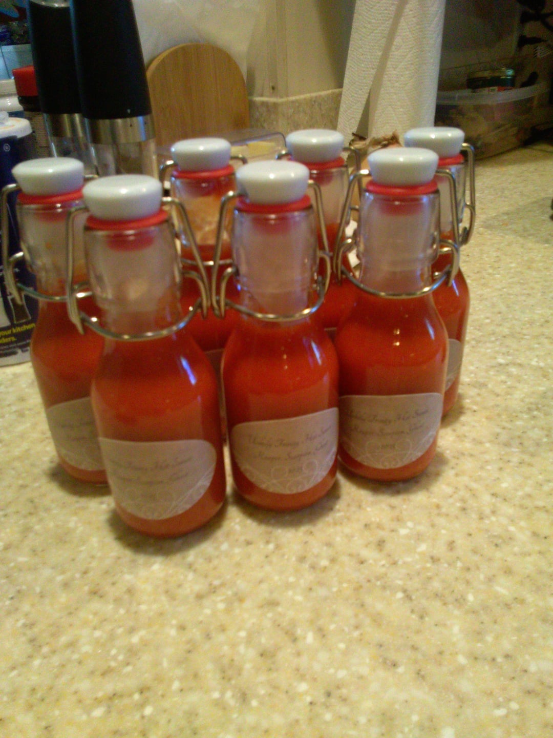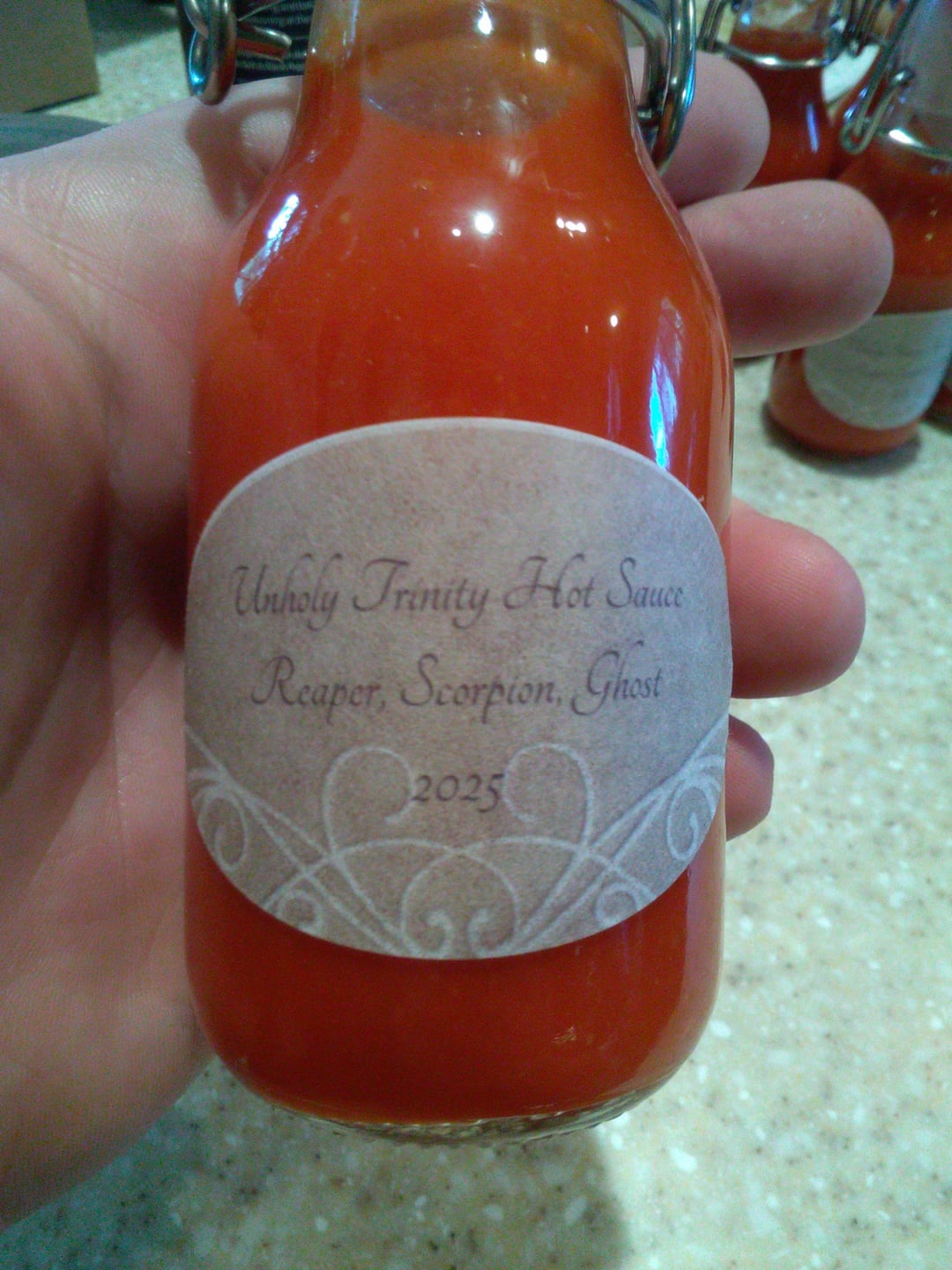Made with a three way mix of Carolina Reapers, Trinidad Moruga Scorpions, and Ghost Peppers. A little over two cups of Apple Cider vinegar, still with "the mother" one yellow onion, and three cloves of garlic. What do you guys think?
