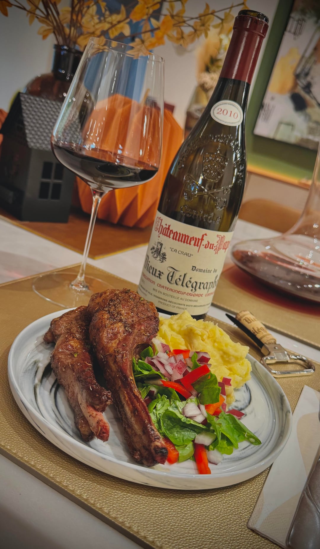 We had an elaborate night out planned, but decided to stay in last minute and cook steak/lamb chops for ourselves instead – along w/ opening up this bottle! Was able to get ahold of this particular bottling last year for $55, a price I couldn't pass up for this region and producer. This vintage was a blend of 65% Grenache, 15% Syrah, 15% Mourvedre, and 5% other varieties – Cinsault, Clairette. Aged 22 months total between oak, concrete and steel. The producer needs no introduction. Stored at 55, used an Ah-so to remove an intact cork – popped and poured to try a little, then decanted for an hour prior to first glass. Enjoyed the remainder of the bottle over the next five hours. Paired with homemade seared lamb chops, mashed potatoes, and a salad.
