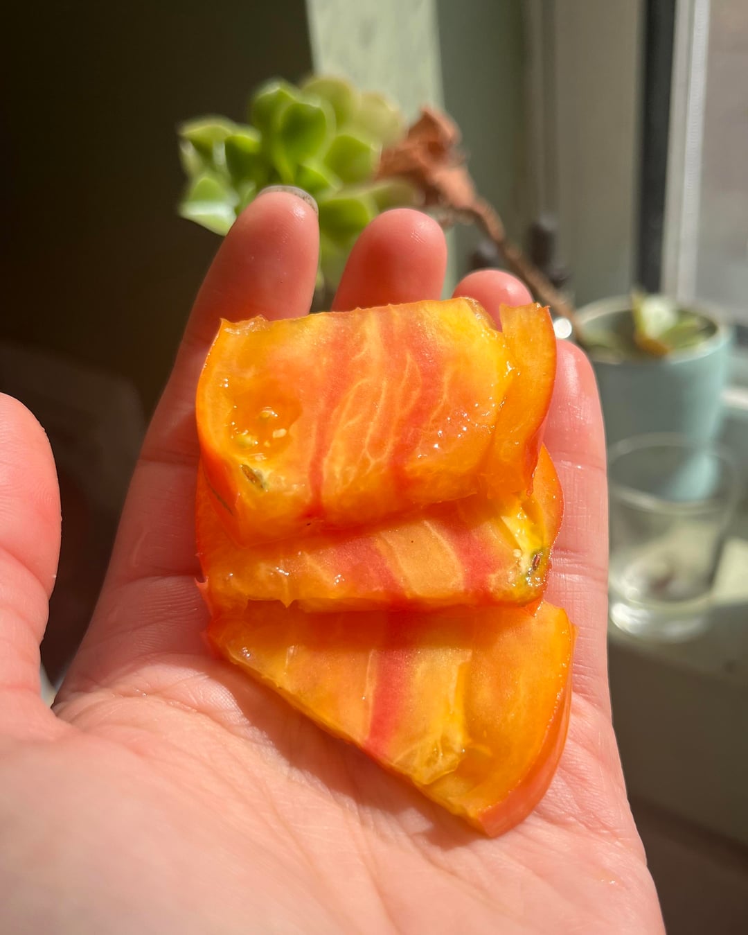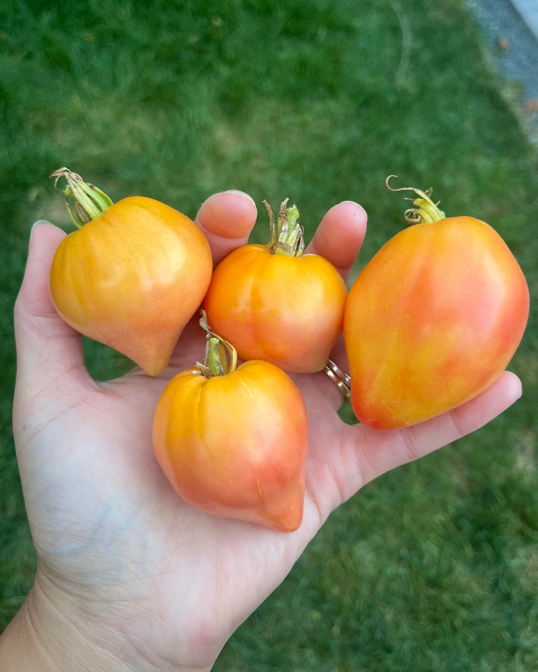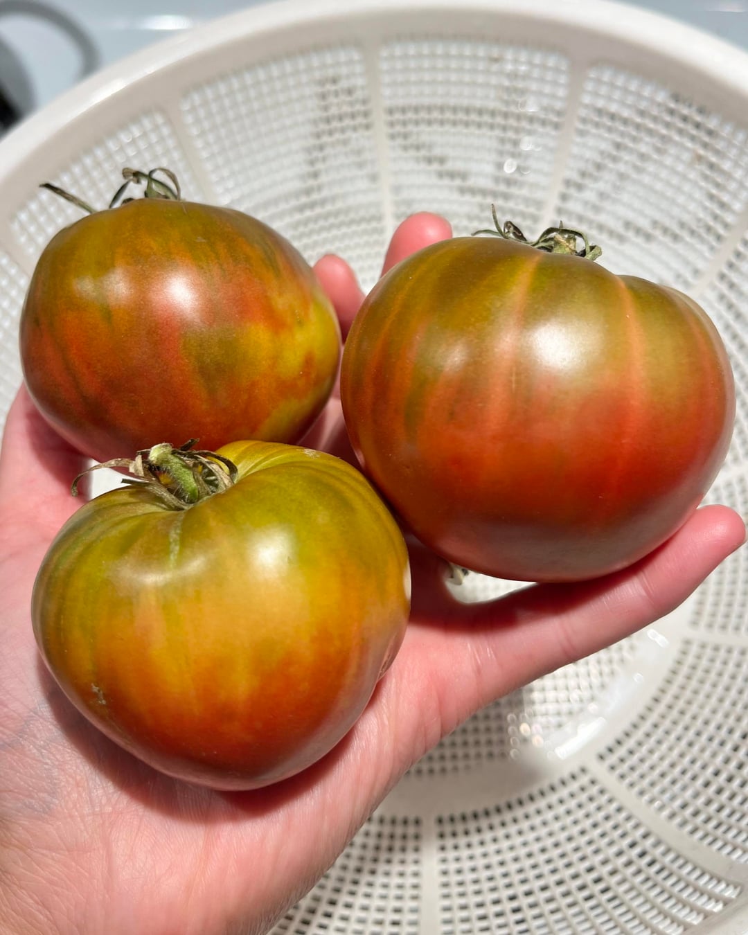 Both from breeder KO — technically ox hearts; some gave me the shape and some didn’t, but I don’t care. I’m growing out of the Midwest and they’re still coming’! Easily one of my fave tomatoes I’ve grown so far. Amazing slicer, have been eating them fresh and they’re tasty as they are beautiful.