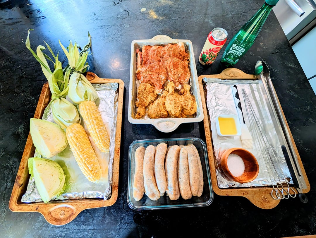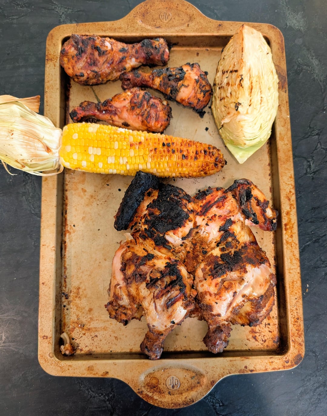 Don’t husk the corn before you grill it. It depends on how good the corn is, but it doesn’t take much direct grilling with the husk on to get it done. Add the drummies at the same time as the corn if they are thick enough. For the corn maybe 10 minutes total time rolling it until the husk blackens on full cook. Keep poking the spatch cocked chicken with a bare finger…it should be somewhere between the feeling of the webbing of your thumb and forefinger when you are making a fist and when you are letting it go limp. Once the spatchcocked chicken firms up tent it on a plate with tin-foil over it next to the grill. The cabbage takes almost no time at all (at least for me). Just give it a little scorch.