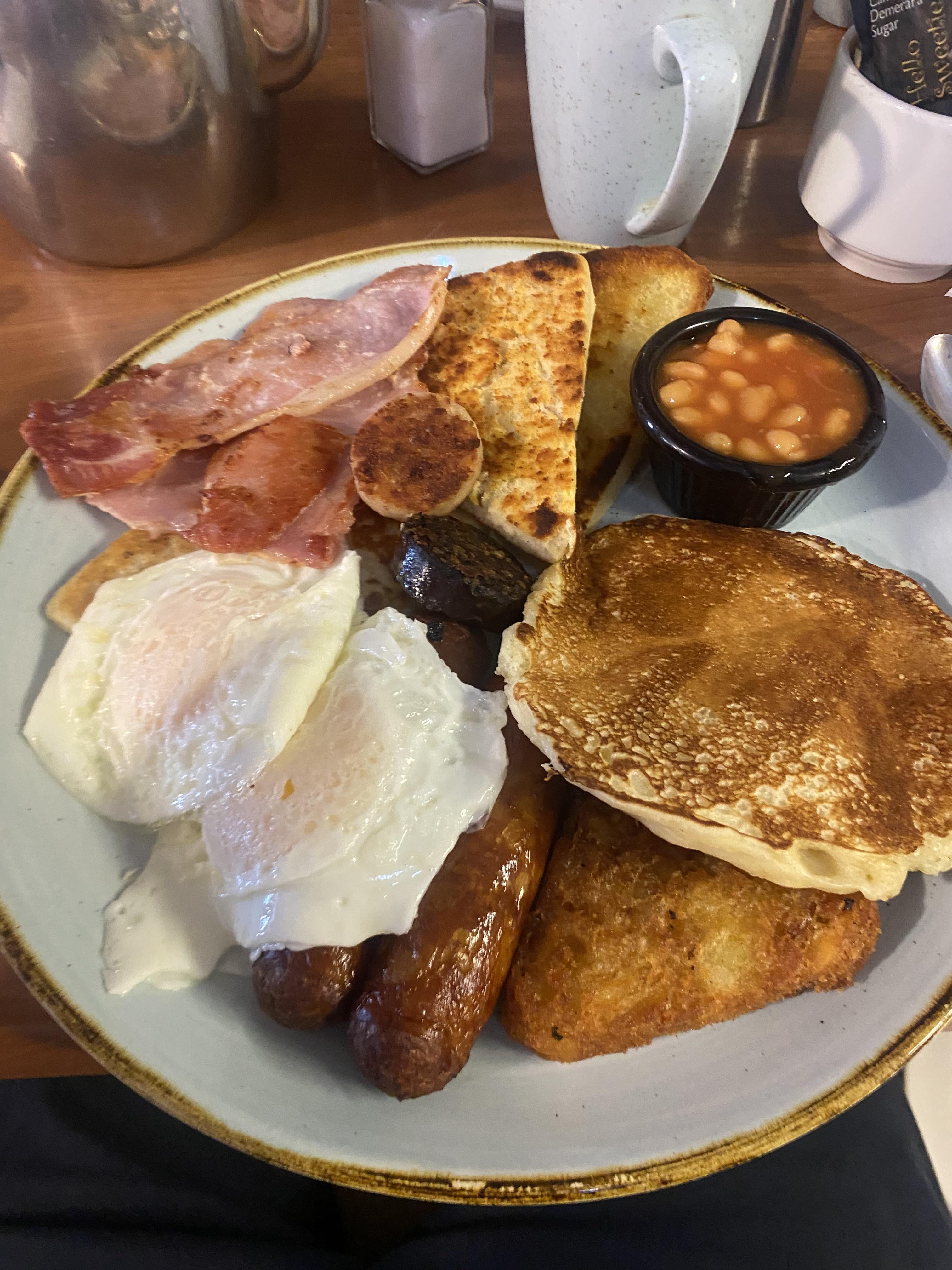 Technically Ulster Fry dosent have beans or hashbrown I like beans on my fry but can take or leave the hashbrown. Comes with toast but with soda bread potato bread and pancake I didn’t need it.