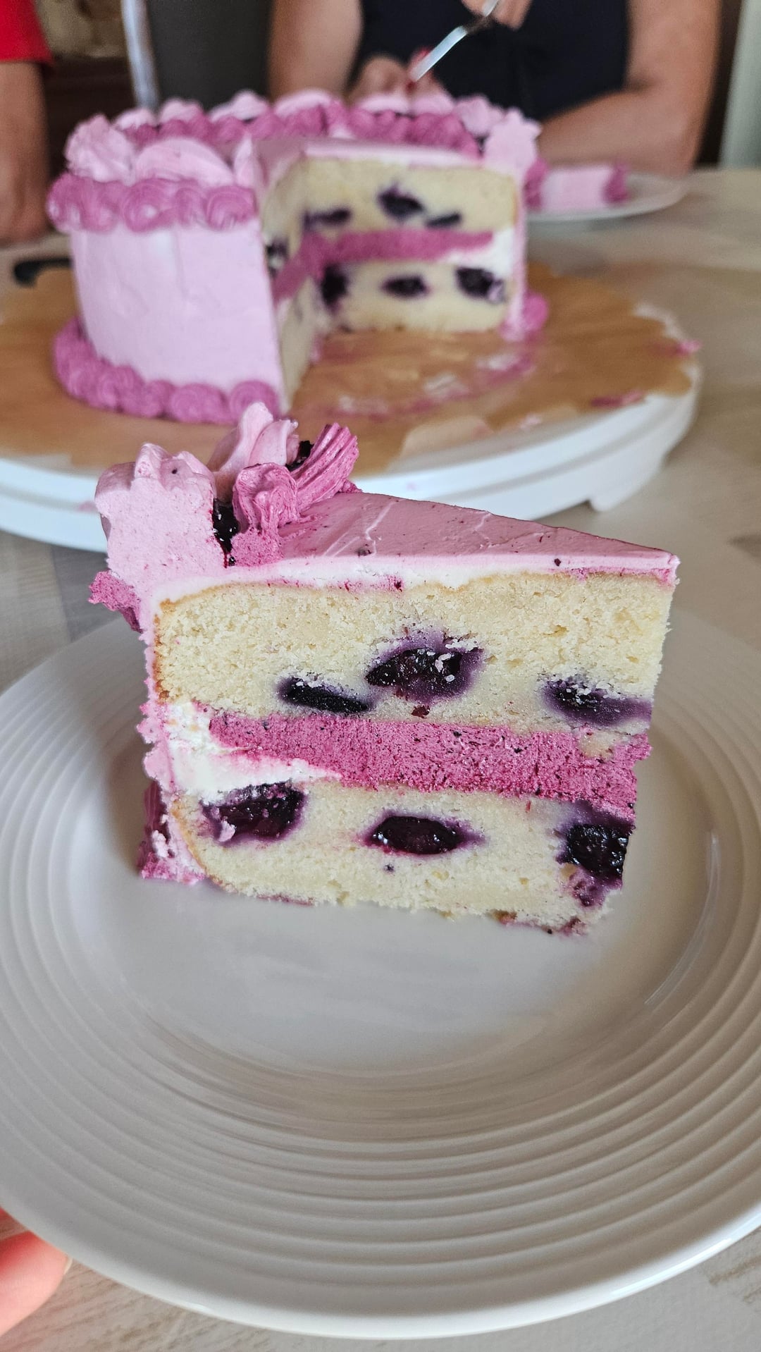 Made a post in r/baking because my crumb was too dense so there's more info, but yall can probably tell blueberry reduction started splitting in the buttercream.