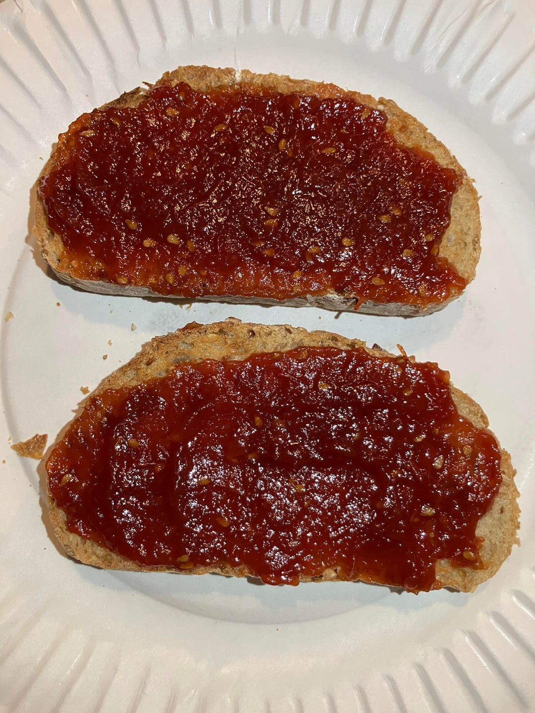 My wife made this tomato jam for the first time with our Midnight Snacks. We had it on multi grain toast last night. It's a new flavor profile for me, & I love the tomato taste!