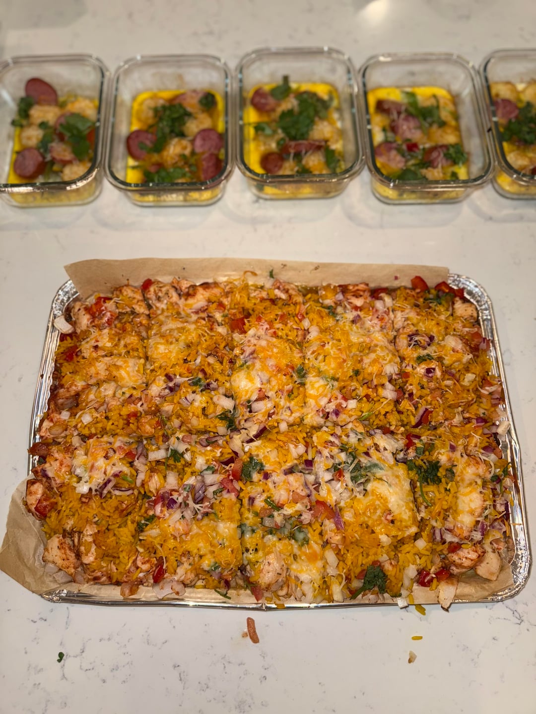 - Prepare rice. (I made mine in a rice cooker). After rice is done, remove chicken from the oven. Place rice on top of the chicken and distribute evenly. Add pico de gallo and shredded cheese on top. Place back in oven for 15 min then broil for 5 min.