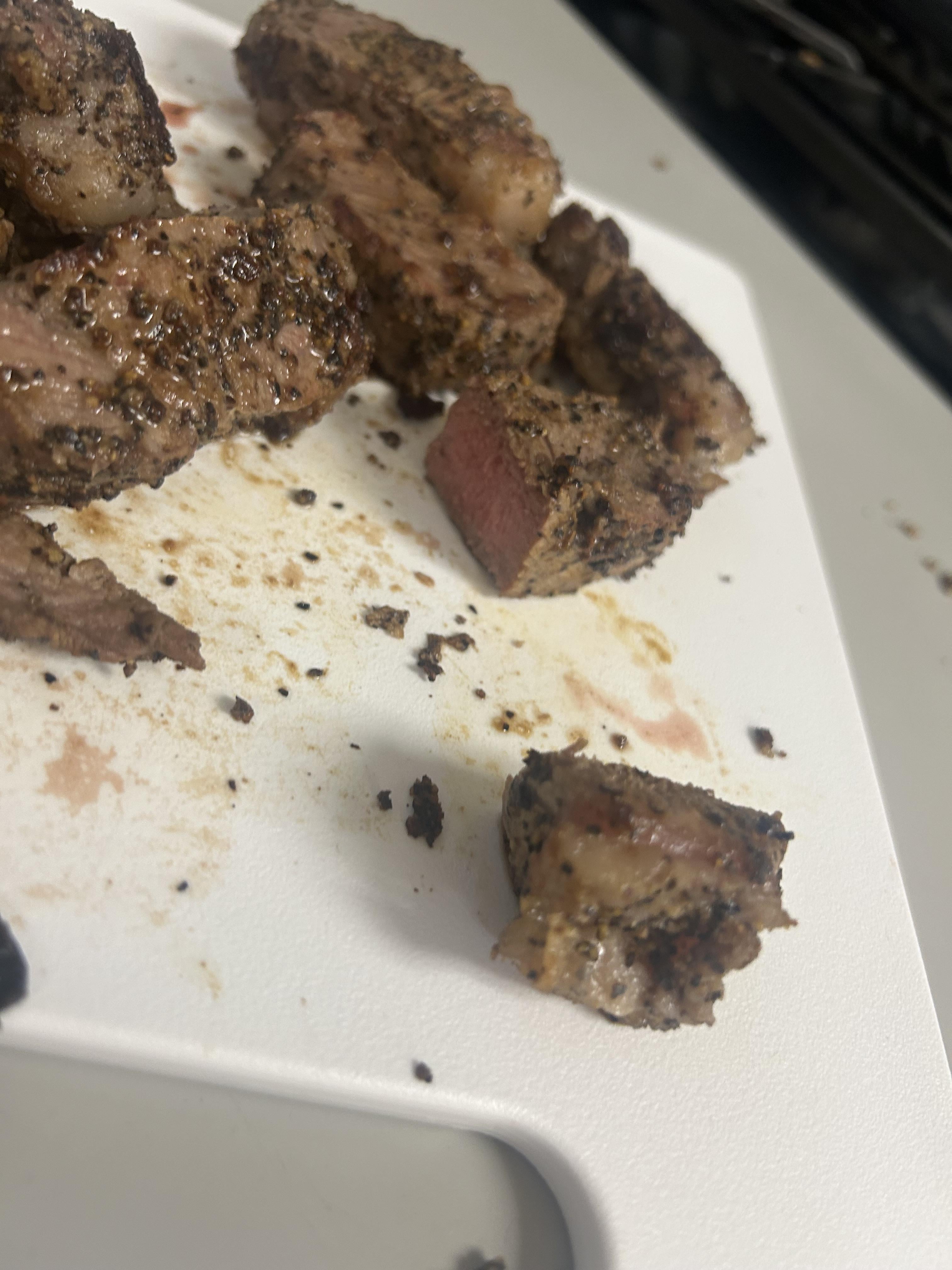 Seared steak on each side high heat 2 minutes and the fatty side 30 seconds on a normal frying pan. Put it in the oven at 500 for 3:30. Came out a little too raw so I cut it up and seared it on each side for 1 minute. Lessons were learnt.