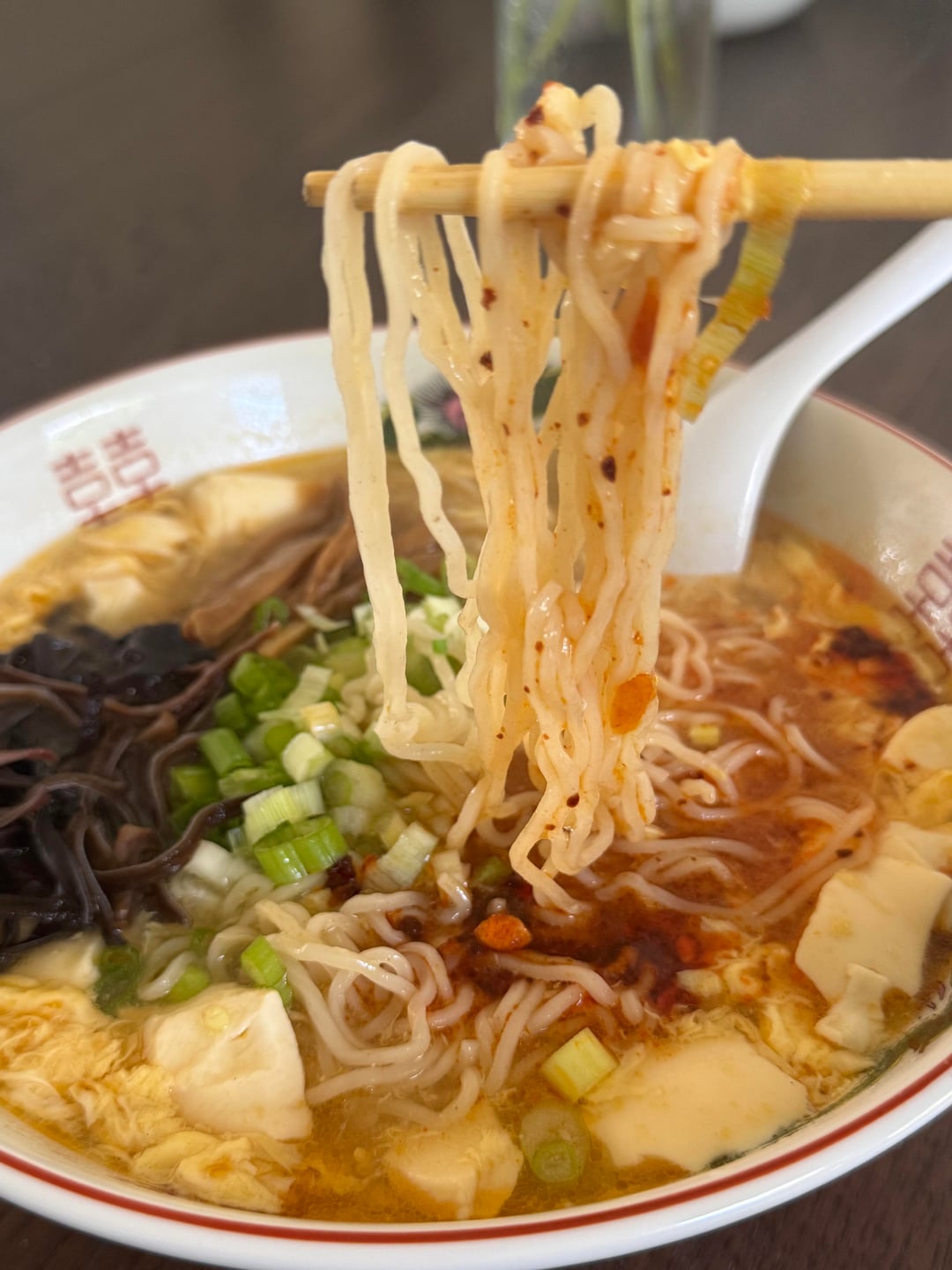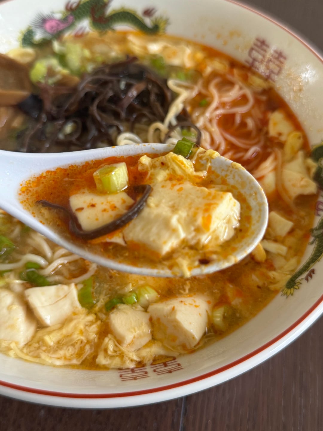 I added a beaten egg and silken tofu to the soup base, and green onions, menma, kikurage and garlic chili crisps as toppings.