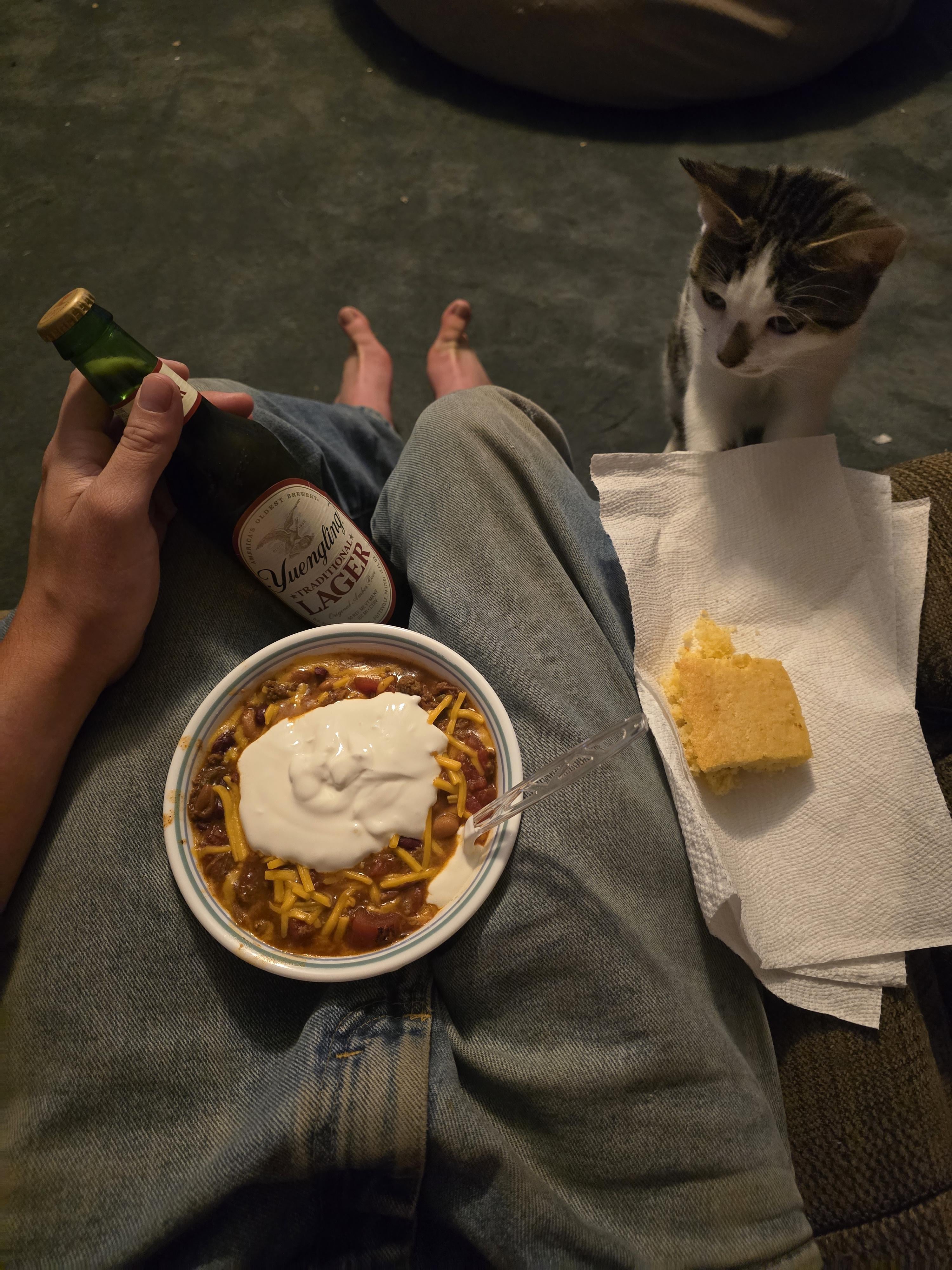 Brisket mfkn chilli with corn bread and my Yuengling! by StolenCoupe 1 Comment NeedleworkerOwn4553 2 weeks ago Hey it’s the toe guy! 😂