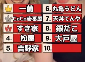 1. Ichiran 2. CoCo Ichibanya 3. Sukiya 4. Matsuya 5. Yoshinoya 6. Marugame Udon 7. Tendon Tenya 8. Gindako 9. O-toya Among them, the popularity of Marugame Udon has recently risen sharply since last year. What’s your favorite?