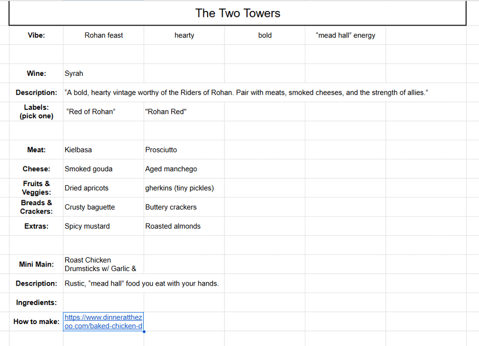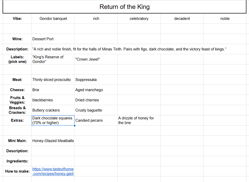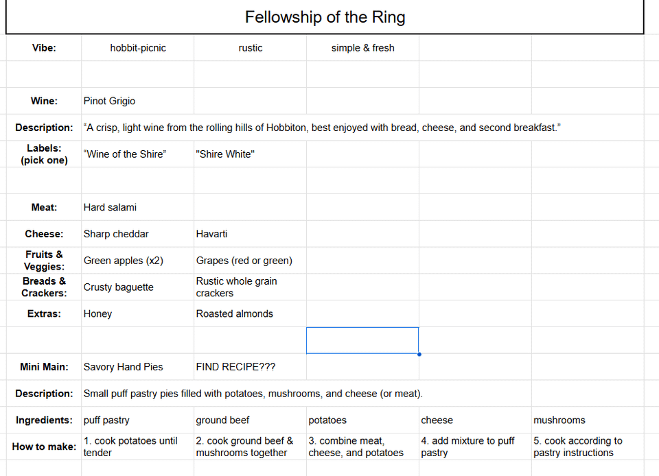 Just do the board and skip the cooking! Aim for 3 cheeses, 3 meats, 2/3 fruits, 3 veg/pickles, crackers, nuts and a chutney. You’ll be stuffed!