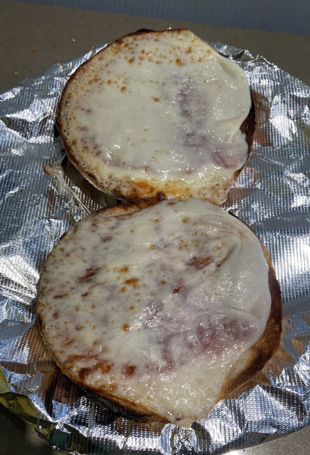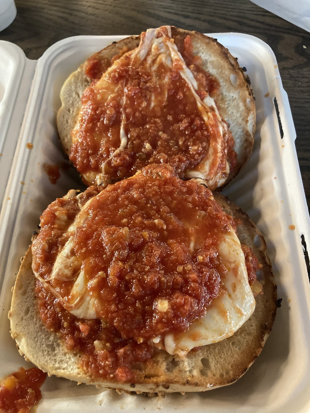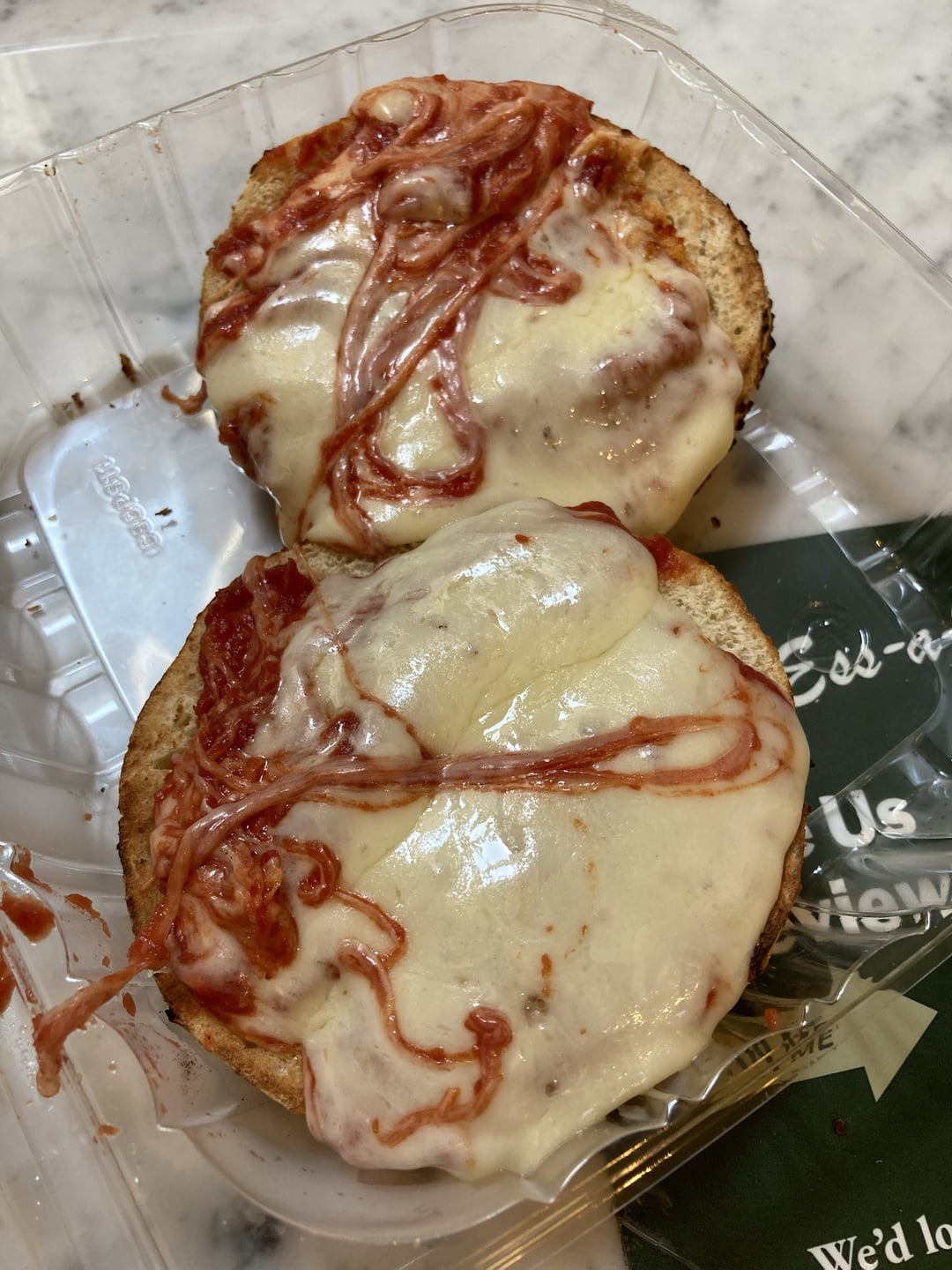 Now we're getting somewhere. Better sauce than Ess-a-bagel, maybe a touch on the salty side. Quality fresh mozz. I used a garlic bagel for this, which sounded good in theory but it may have been a tad strong. Might do onion next time. I also appreciated the extra dollops of sauce.