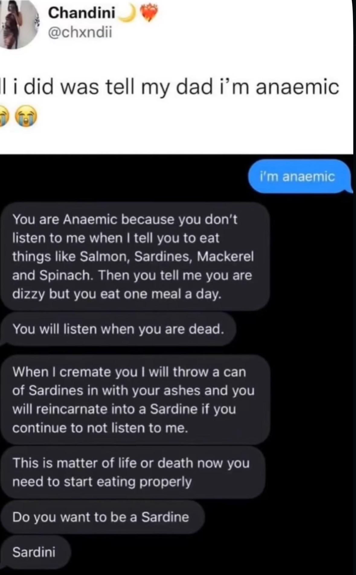 Damn Dad crashed out but I love that it was about Sardines 🤣