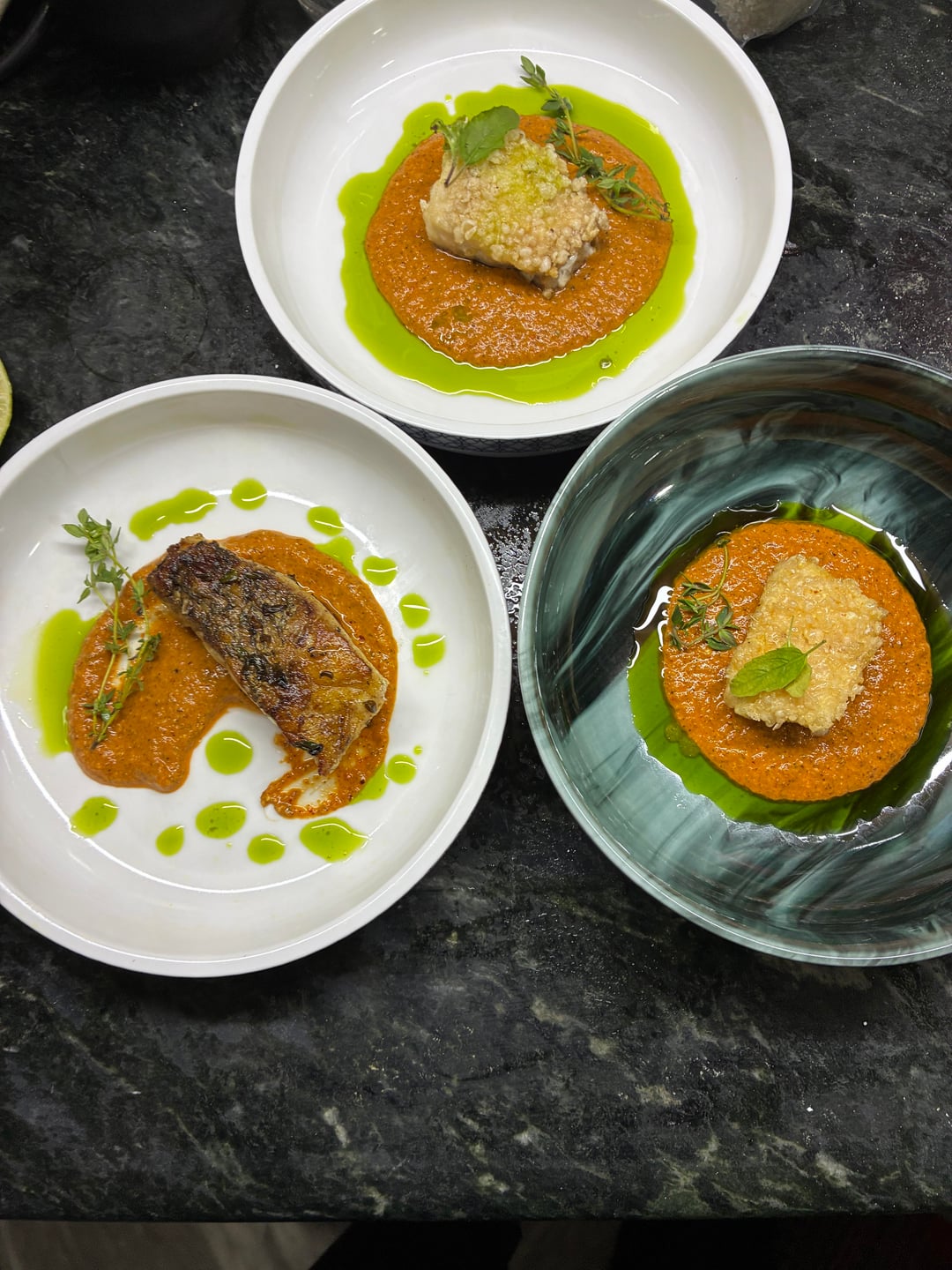 Way too much romesco on all three, as tasty as it may be. Is the fish hiding under the crisps? The dill oil is a great concept but is messy in all three iterations. The sprigs of thyme are ugly AF. Pick off the leaves.