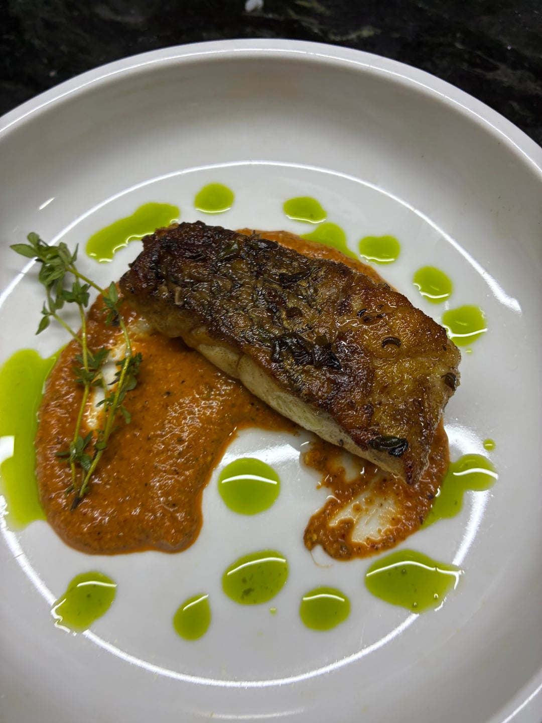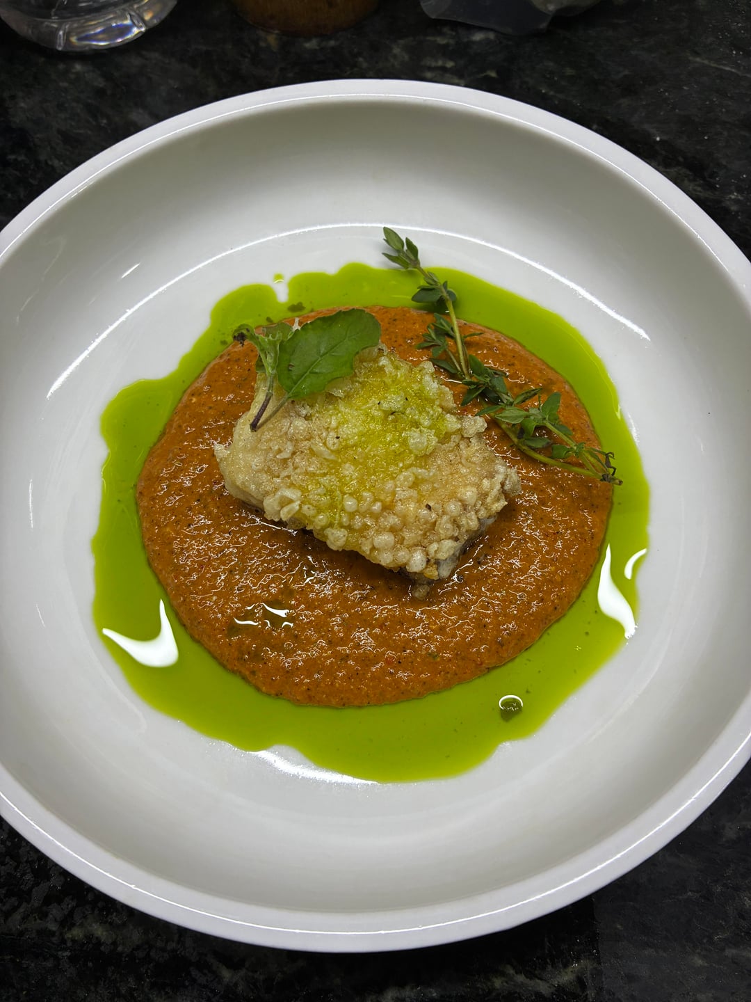 Red snapper, romesco, dill oil, dehydrated tapioca crisp