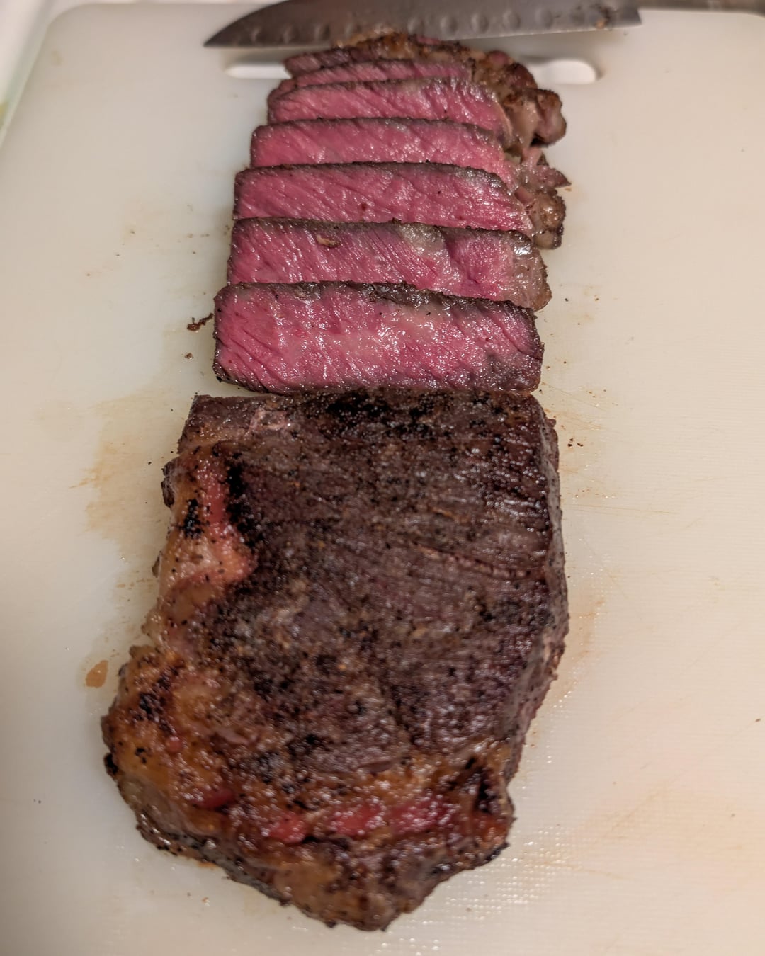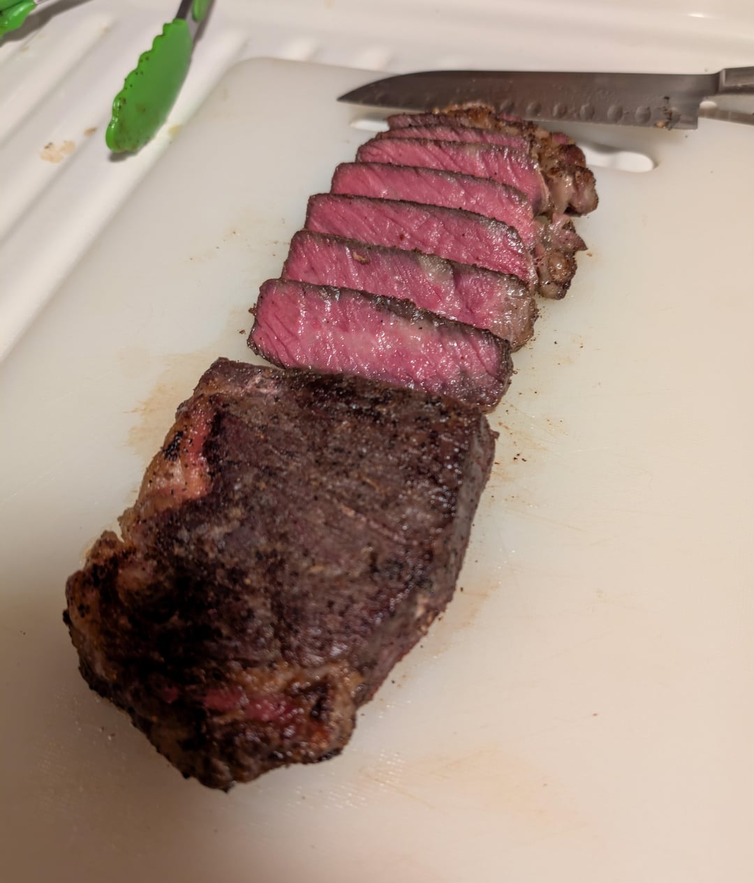 That steak has somewhat ok marbling before cook. After cook is looking successful to me. You have a little crust on the outside, and inside the steak is medium rare edge to edge as it should be. That seems a very reasonable drunken-cook-steak chef !!! If this was your drunk work☺️ Well done ! 👏🏻👏🏻🥇. Enjoy and cheers 🍻.