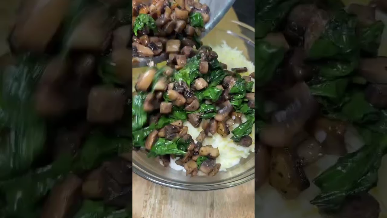 ❤️In a bowl, combine cream cheese, mozzarella, most of the Parmesan, and the mushroom-spinach mixture. Mix thoroughly.