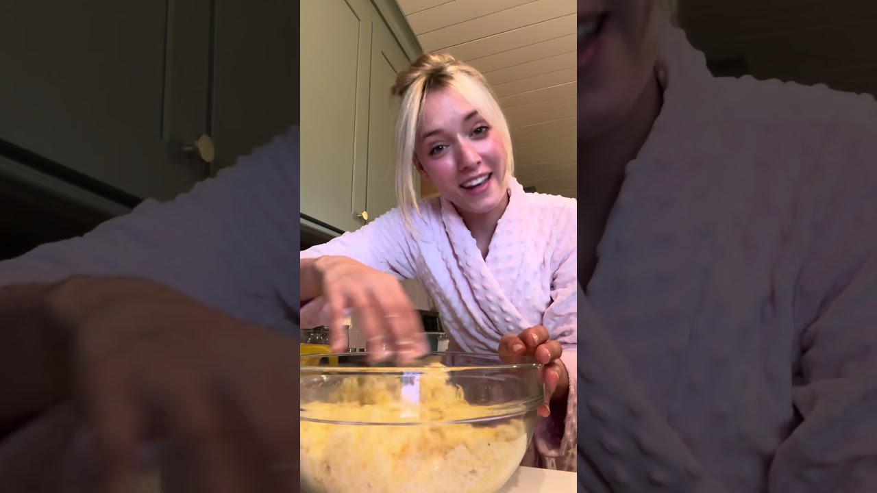 Now, if this ain’t a heart attack and a hot dish, I don’t know what is. I’m making homemade tater tots. Sorry, I’m just bringing you in for the end result, but I’ve been dreaming about a tater tot shepherd’s pie that I had on the road with Cody Johnson a couple weeks ago. Just whoever was doing catering made it and they don’t know it, but I’ve dreamed about it. And I didn’t have time to go buy tater tots today. But you know what? I did have a bunch of potatoes from my garden that I needed to use up anyway. So, I’m using my nifty KitchenAid attachment to do all the work for me. And look at that. My hands are shaking. I’m so hungry. Now that we have our bowl of hash browns, we’re going to add basically like a teaspoon of salt, teaspoon of pepper, some onion powder, and some garlic powder. And the last thing we need is about 1/4 cup of flour. And then we’re just going to use our fingers. You think I was going to use a spoon? I’m cooking in my robe on the internet. I ain’t got nothing to hide, and I ain’t got nothing yucky on my fingers. Now we just take them and make little tater tots. Look how cute. It’s a tater tot. M. This is really fun. Want to get our tater tots into our oil. I ain’t never deep fried anything in my life. Okay, we’re going to put our filling in a dish. This is ground beef, onion, garlic, carrots, peas, tomato paste, beef broth, and seasonings. And it’s so good. And now we’re topping that with shredded cheddar cheese. Then you take all your little tater tots and you put them on top. And we’re going to pop it in the oven. Now, if this ain’t a heart attack in a hot dish, I don’t know what is, but it’s going to be good. We’ll top it with some of our freeze-dried basil. You know, for color, because, you know, you’re supposed to have a colorful plate. A, you’re wearing my merch. Am I not allowed to? No, you can’t. I just think it’s funny. Okay, let me see what you think. It looks so bougie. It’s good. It’s like chicken pot pie but with beef and tater tots and no pie crust and cheese. Okay. I want to taste it. I want it to taste like that one we had in catering at Cody’s show. I don’t think I ever had that. Maybe you weren’t there. I don’t. Okay. Let’s see. It’s
