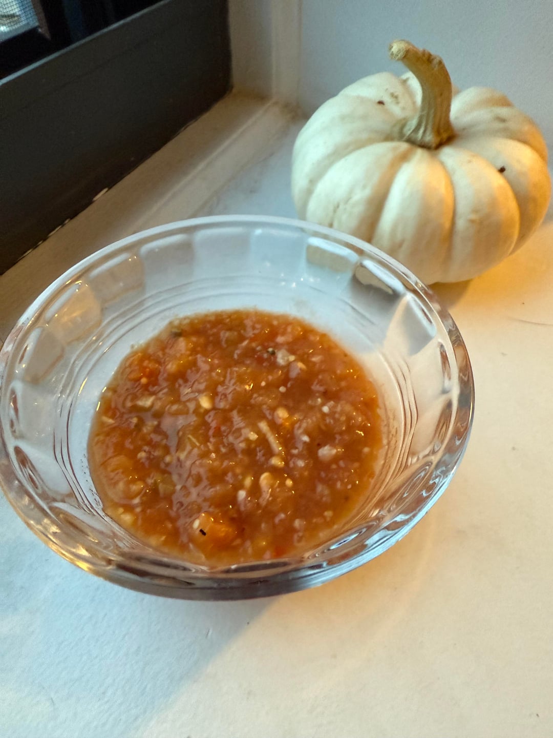 RECIPE (totally DIY based on what we had): -3 small-medium tomatoes -3 tomatillos -3 banana peppers -4 deseeded habaneros -half a large white onion -3 cloves garlic -a small lime’s worth of juice (would’ve totally added zest if it was a better lime) -tsp? Coriander (would’ve used fresh cilantro if I had it) -also tsp or so Mexican oregano -splash of v8 for some liquid lol -lil squeeze of tomato paste (maybe would have omitted next time but just to try it out) -salt to taste