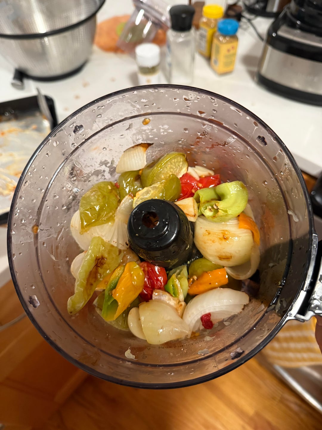Added everything except seasoning, tomato paste ,v8 + lime to toaster oven at 425F incrementally (onion+tomatillos, then banana peppers+tomato, then garlic+habs) over the course of like 20 min. Low on food processor for a bit, adding rest of things until smooth. Yum!