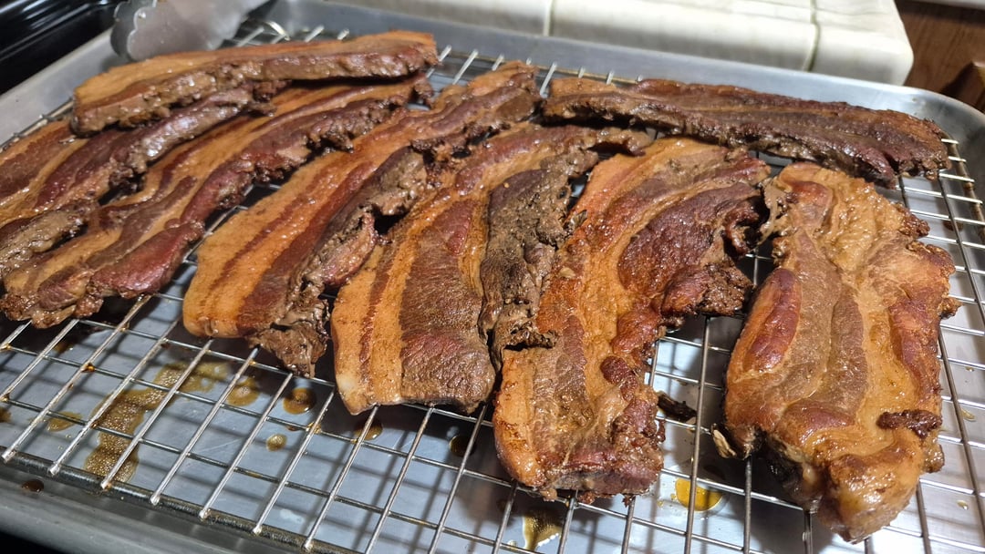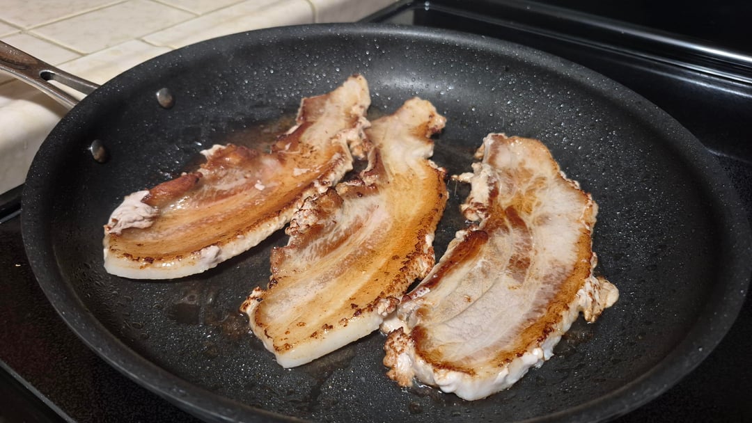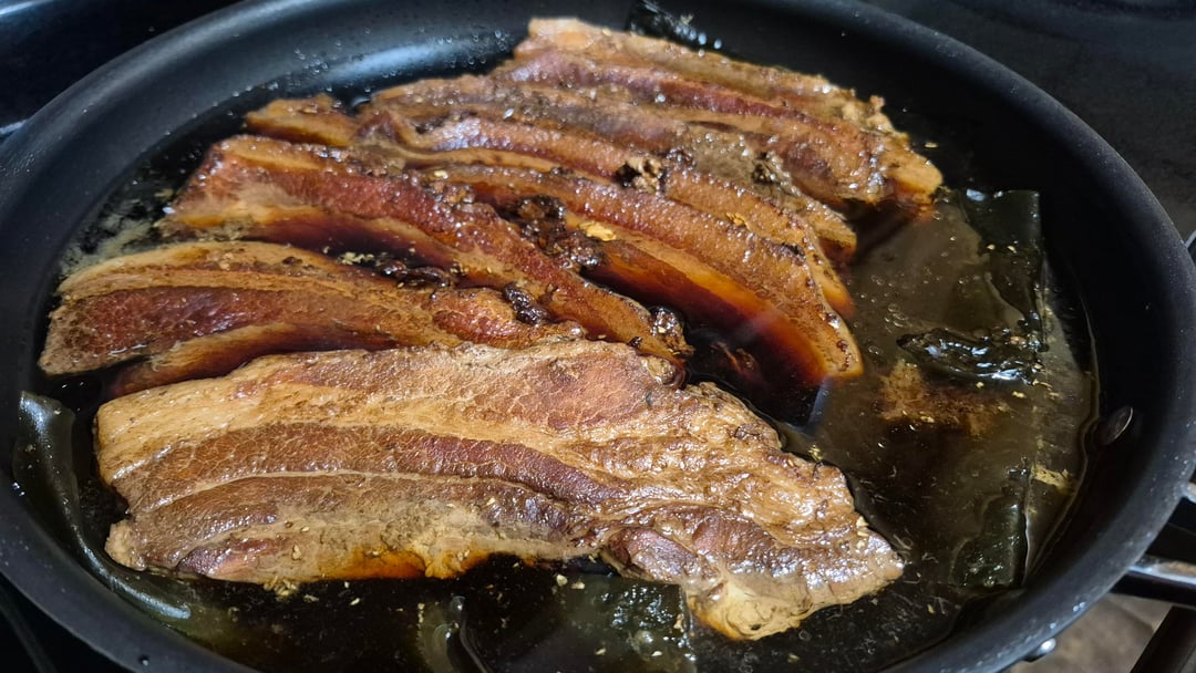 Good first try! Pork belly tastes good no matter how you prepare it. Get a thick piece next time though, the flavor and texture is really something else when it literally falls apart.