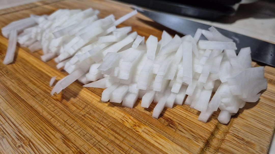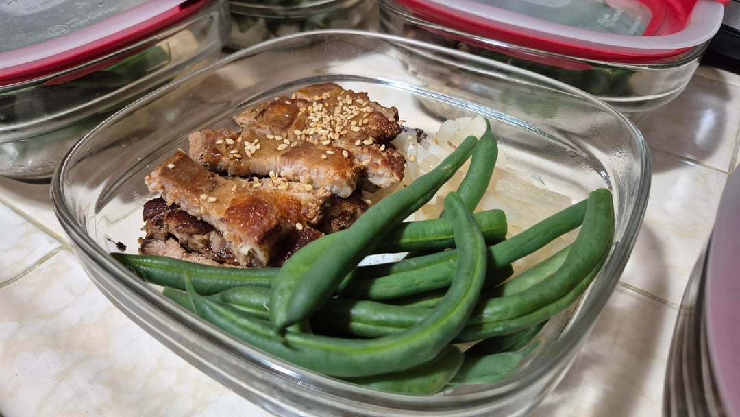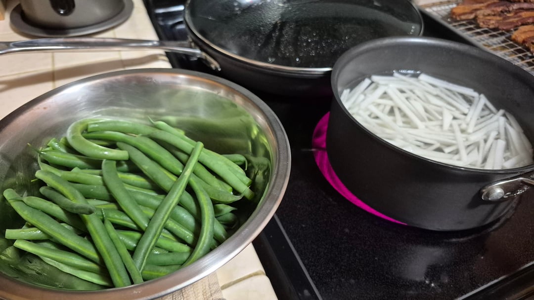 Chashu with daikon & green beans. Braised for 2 hours with soy sauce, sake, ginger, konbu, and sugar.