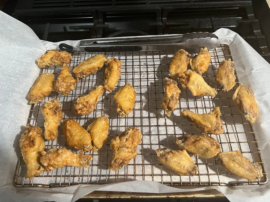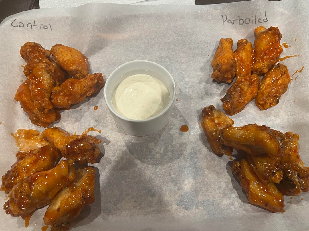 Results: The parboiled retained a little more moisture and they were more tender but at the cost of losing some of that crunch. The parboiled ones also didn’t hold on to the starch as well when tossing them so you miss out on the little crispy bits. But they fried quicker and were a little less greasy. Overall I preferred the control group but if I were making a ton of wings and could parboil them the day ahead I think I would.