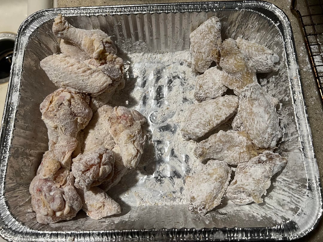 The control (left) I tossed in corn starch, fried for 8 minutes, rested, then double fried for about 4 more minutes. @375 degrees.