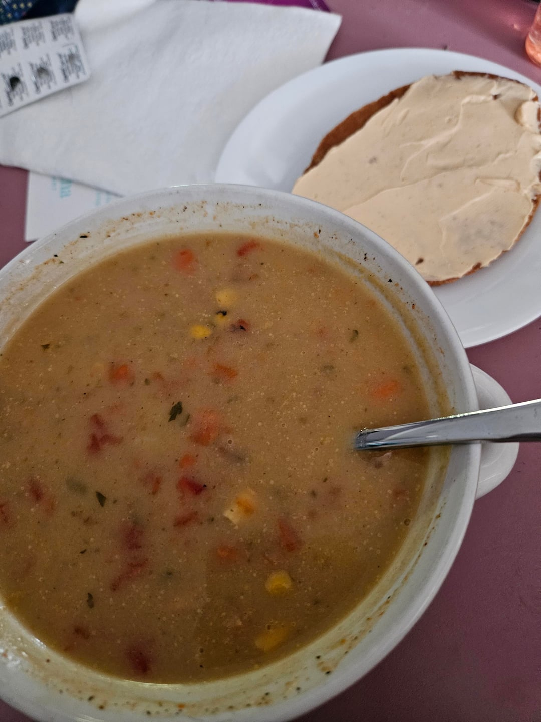 Lunch: Progresso Pittmaster chicken soup, and a flat croissant with pumpkin cream cheese. Excellent sweet and salty satisfaction. The flat croissants are a popular Korean snack to pack in a lunch box, I've had them with brie and just plain with my coffee and they're great.