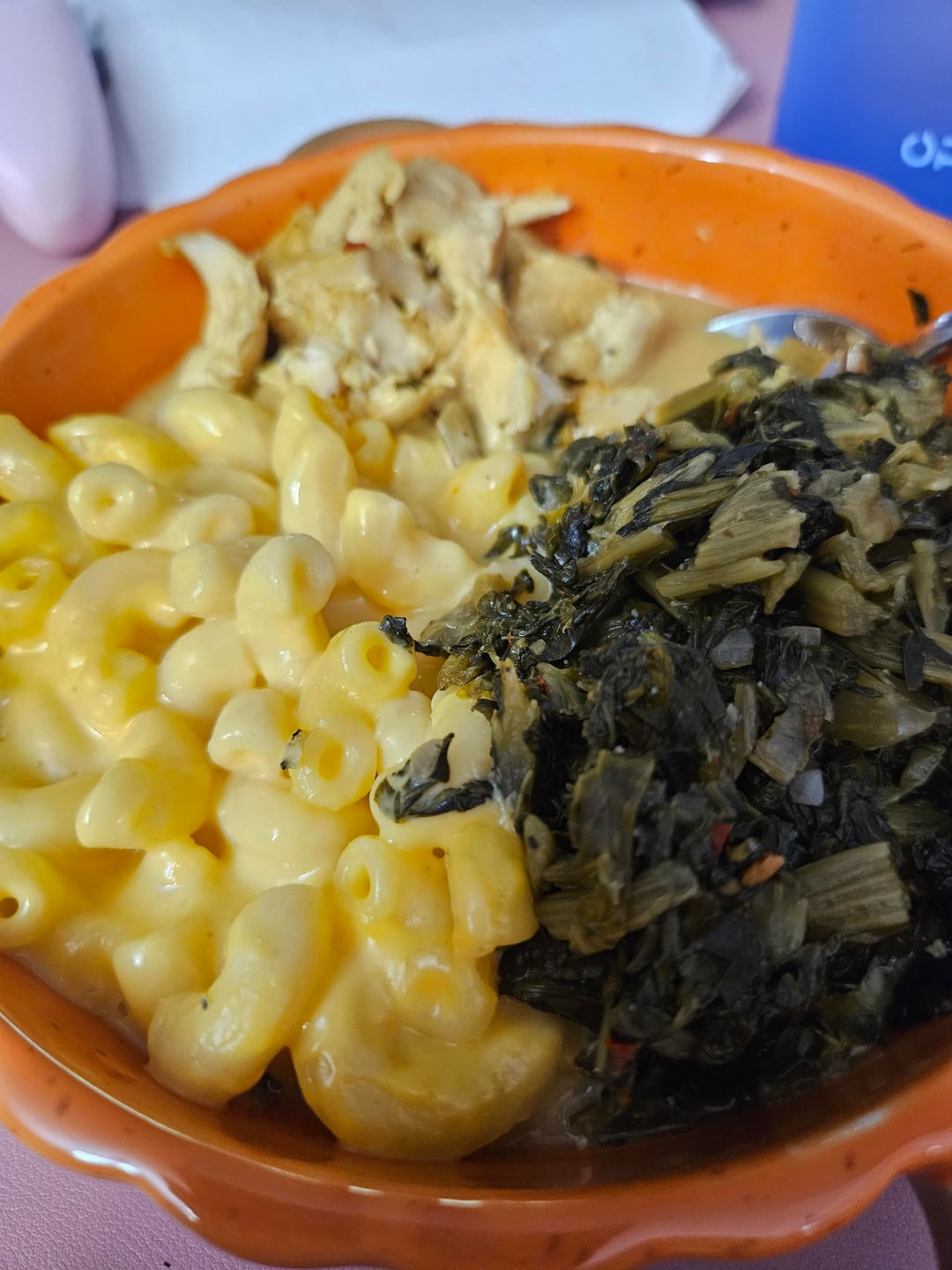 Dinner: Kevin's Natural Thai coconut chicken, Maine Street Bistro mac and cheese, and Glory mixed greens. I eat low fat in general, so this was just my inner goblin wanting something that felt indulgent. The chicken and Mac are in my grocer's fridge section, the mac i had a 1.5 serving size and the Chicken i had the normal 5oz serving. The greens are from the can and I typically open a big can, dump it in Tupperware with a bit more pepper and some white vinegar, and eat from it during the week when my meal needs a bit of filler. Some of the other Glory varieties are lower calorie per serving but this is what the store had this week. If I did a meal prep with these items I could either split it in two like you see here and have a leftover serving of chicken, or split it in 3 if I wasn't such a little piggie for Mac and cheese…