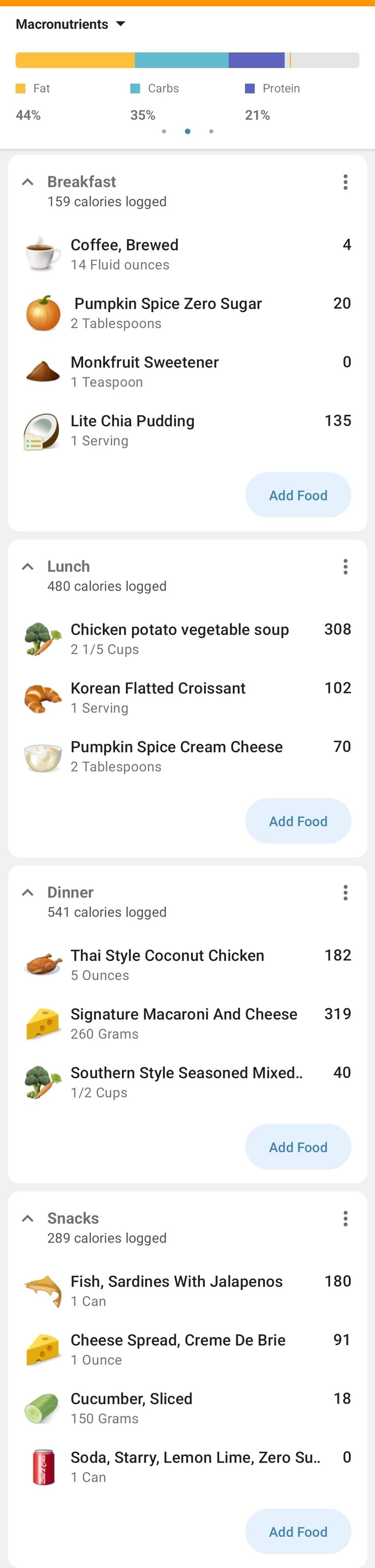 This was an 80g protien day, I aim for between 65 and 90. For medical reasons I can't do much beside basic stretches and chair exercise, but as far I'm down 42lbs since November. I posted this because it can seem really daunting to cook everything all the time, and honestly it can be – especially when you have a family and they're not eating what you're eating. But you don't have to cook every day if you take a good look around your grocery store and invest in a little food scale.