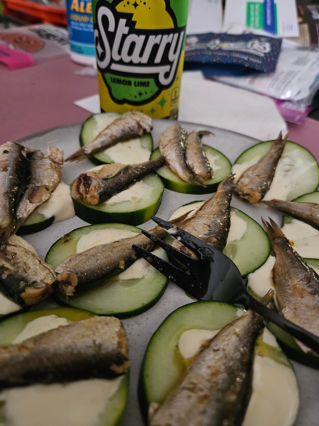 Snack: Jalapeno sardines and a tiny smidge of Alouette brie on sliced cucumber, with a sprinkle of lemon salt – and a zero sugar Starry. When I was a kid diet soda tasted like a melted car tire, but these zero sugar varieties are legit. Ive had Coke Zero and Dr Pepper Strawberry Zero, along with a couple others. Very good for that soda fix i need every week or so.
