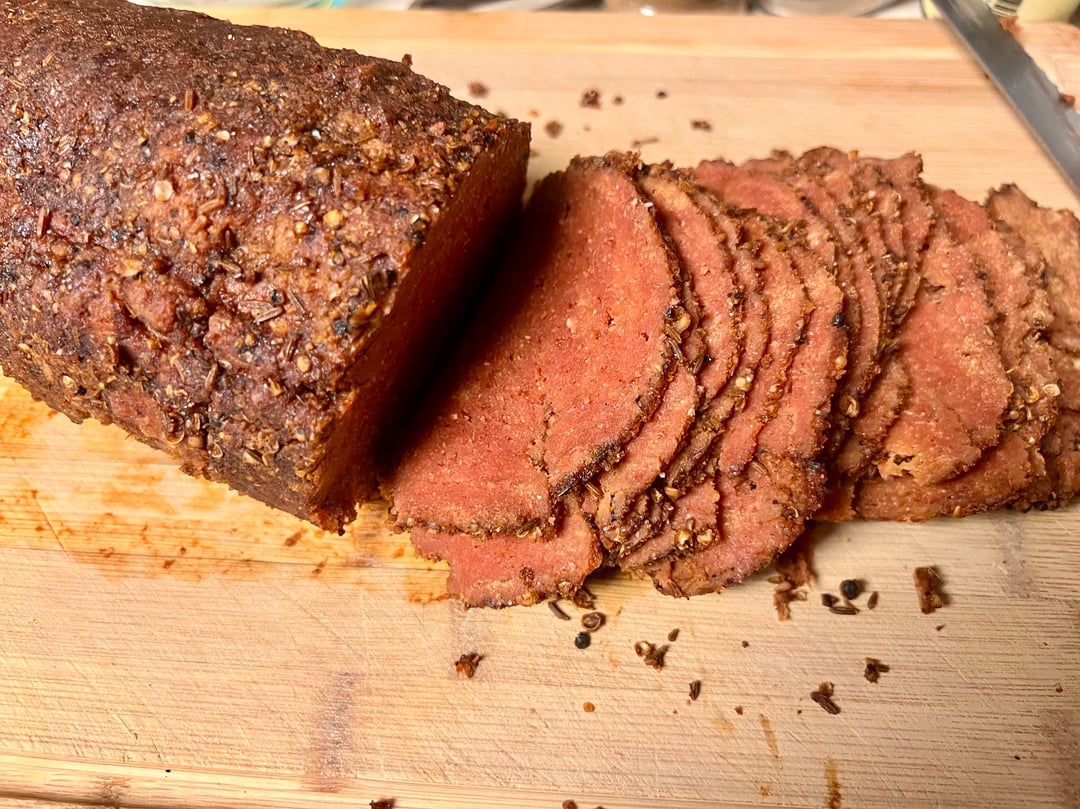 This is Wicked Kitchen’s Seitan Reubens recipe but it’s genuinely one of the best seitan recipes I make. I’ve found over time that halving the seasoning the recipe calls for (the spices on the outside) helps and means you can make 2 pastrami rolls with one batch.
