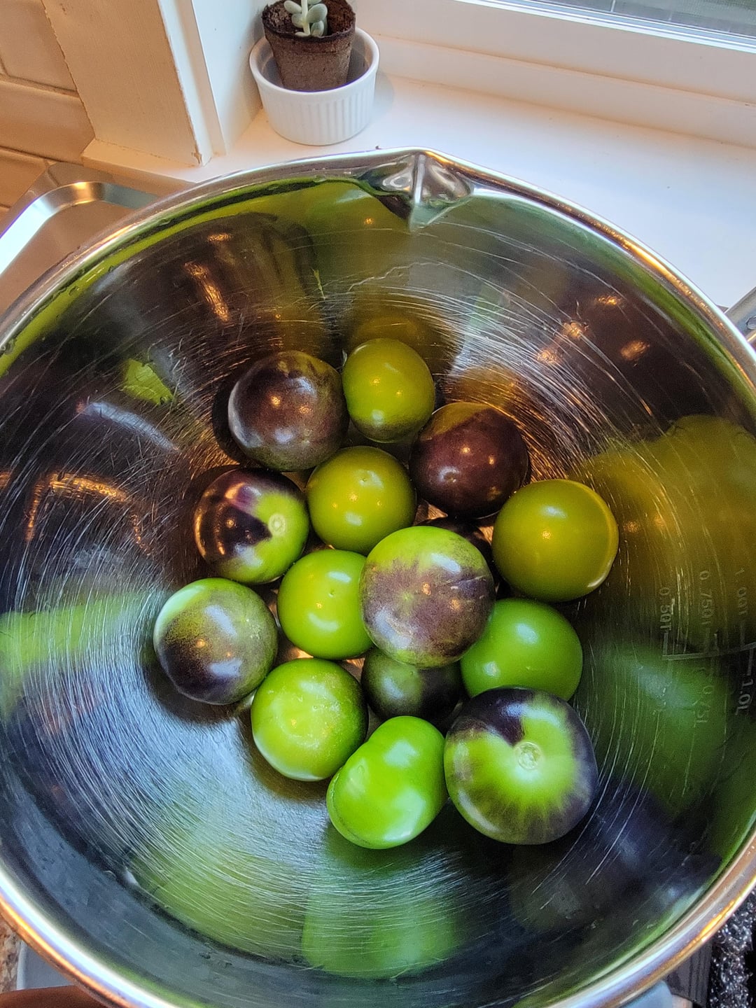 Four tomatoes from the garden (2 cherokee purple and 2 idk some standard red)