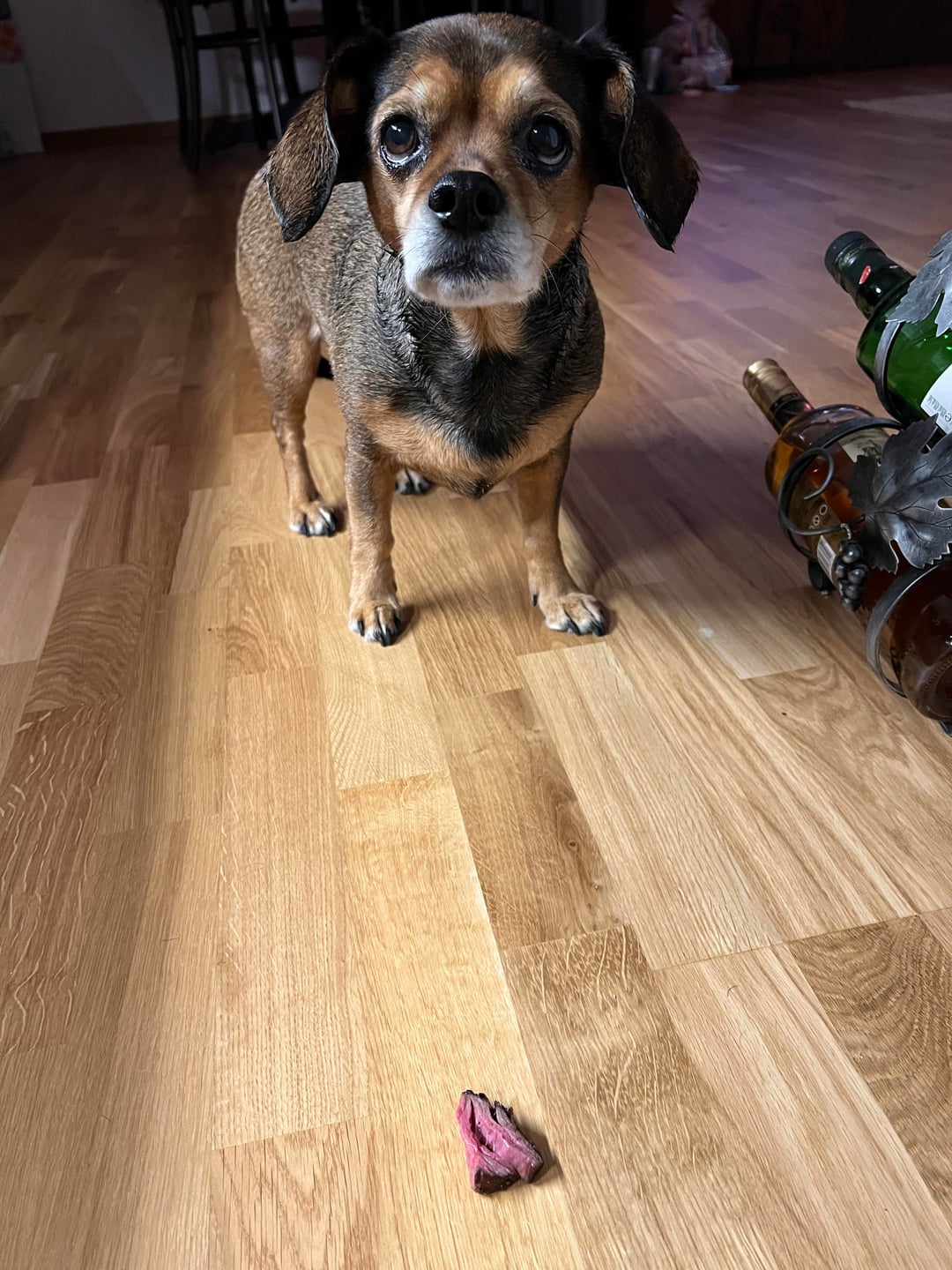Poor pup is wondering “where is the rest of my steak?”