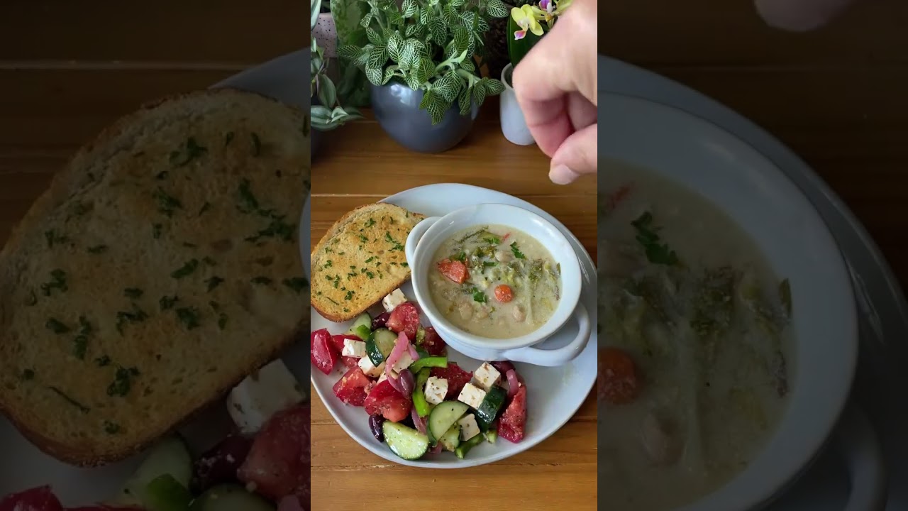 A cozy lunch for the first day of fall. Escarole Cannellini Bean Chicken Avgolemono soup, Greek salad and sourdough garlic toast. So comforting and delicious. Here’s how to make the soup: