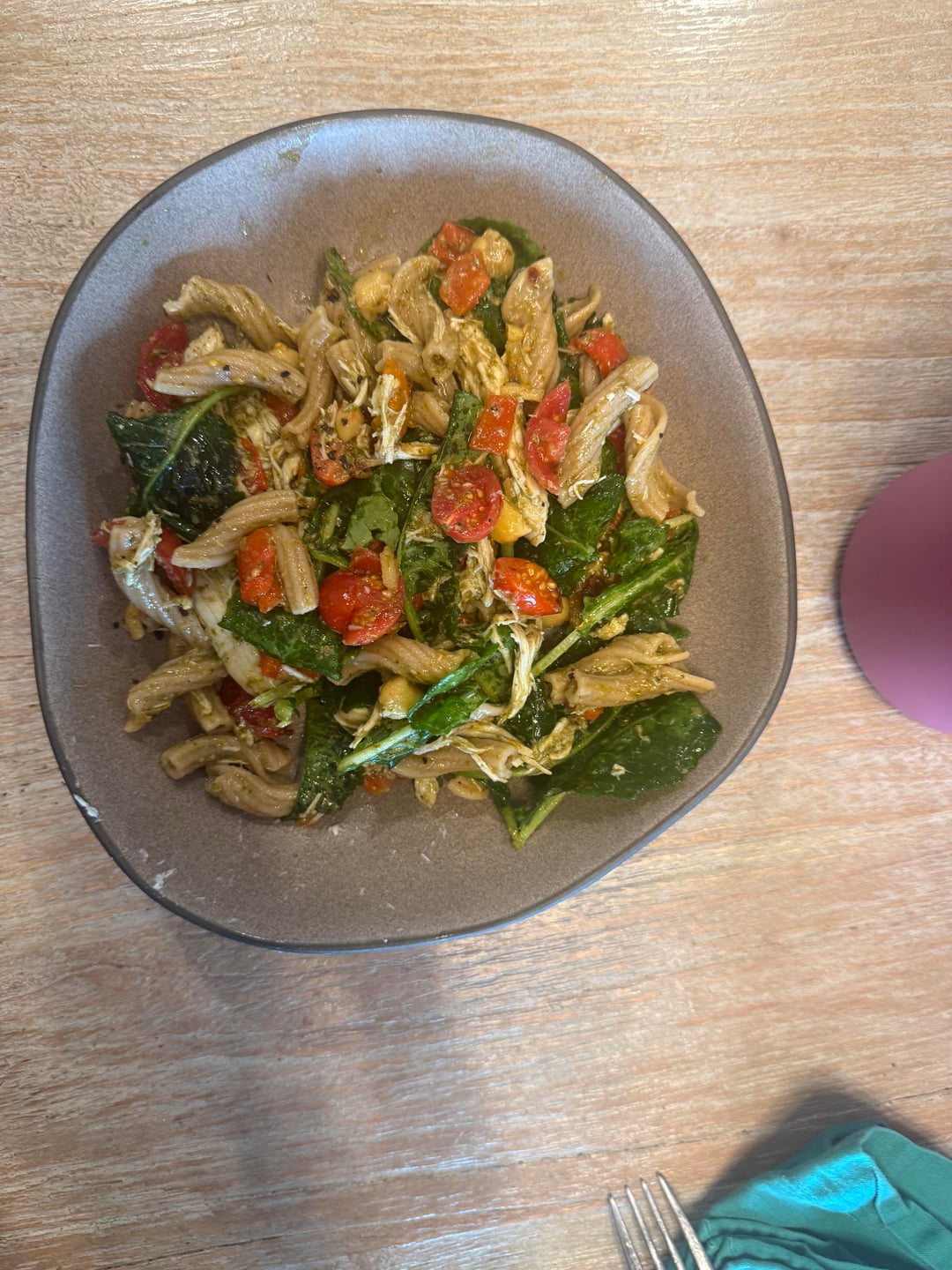 The pasta got tossed with pesto. The veggies got lemon too.
