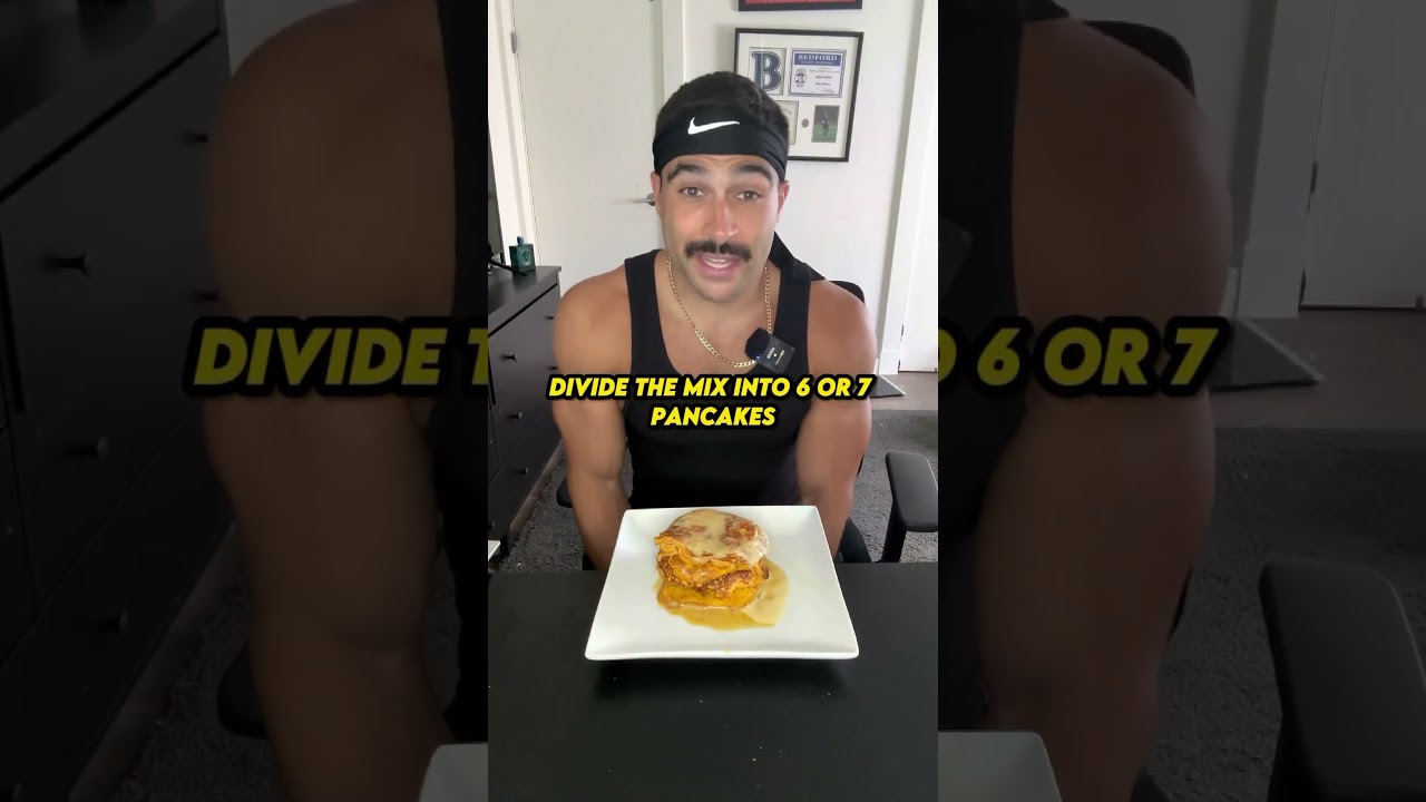 These pumpkin spice pancakes right here have 87 g of protein, 14 g of fiber, 63% of your daily vitamin needs, and 65% of your daily mineral needs. I’ll show all the total nutrients at the end of the video. Let’s go. Grab a bowl. 400 g of pumpkin puree. This will add vitamin A, vitamin E, vitamin K, fiber, magnesium, potassium. Four eggs. This will add B vitamins and choline. 60 grams of vanilla whey protein. I get mine from Legion Code Sills to save. 20 grams of almond flour. This will add vitamin E, magnesium, 1 teaspoon of vanilla extract for vitamin F, cinnamon, pumpkin spice seasoning mix, baking powder, salt. Whisk it up. Divide the mix into six or seven pancakes, 2 to 3 minutes per side. You can also use a bigger pan to save time. Now for the most important part, our icing. 40 g of full fat Greek yogurt. I’m actually using kafir here. 15 g of vanilla whey protein. 10 g of maple syrup. Quick mix. Throw it on top. Hit it with some syrup. Kiwi gang, we have done it again. Let’s go.