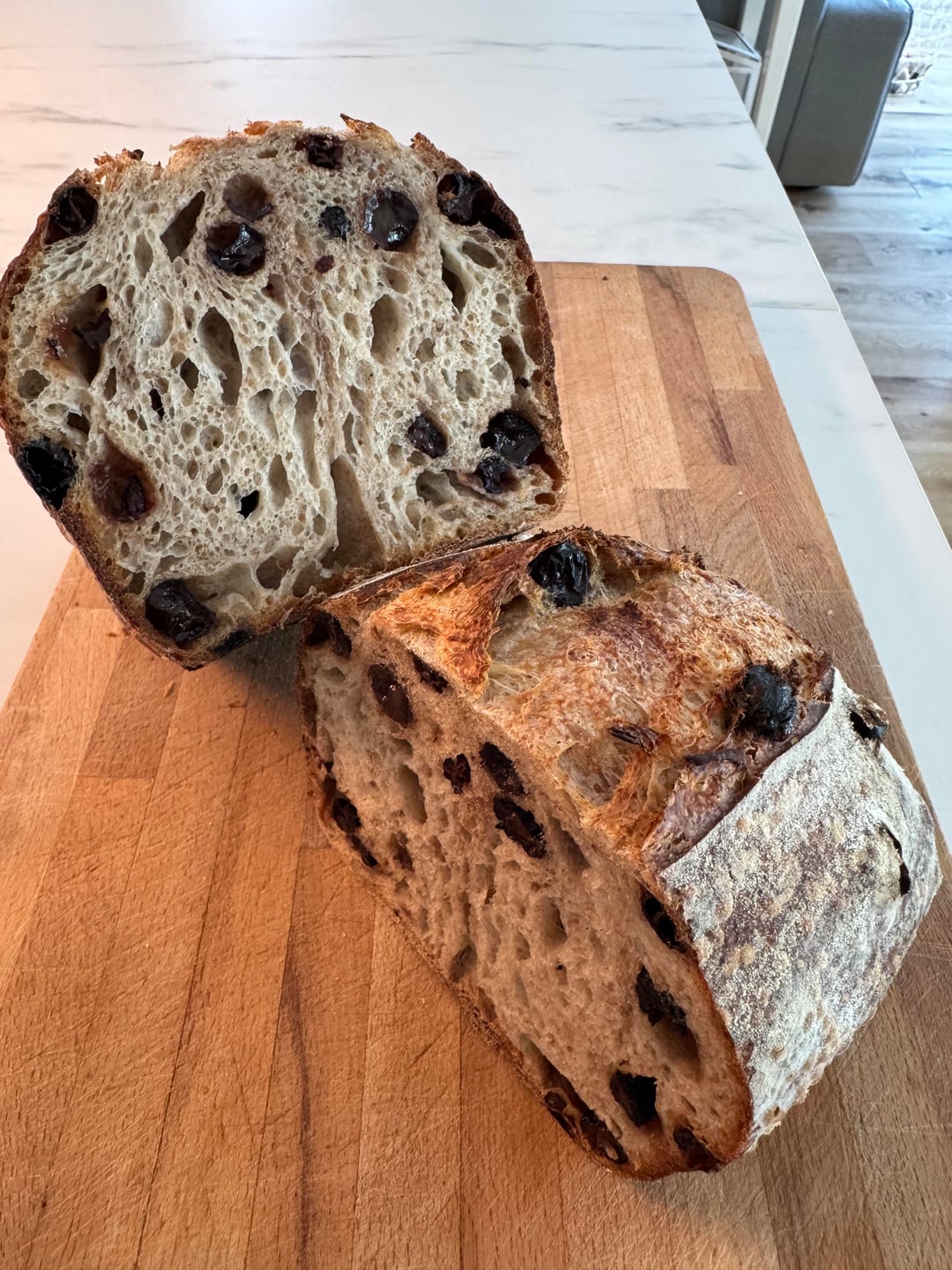 - First stretch & fold. Rest 30min. Soak 90g black raisins in water.
