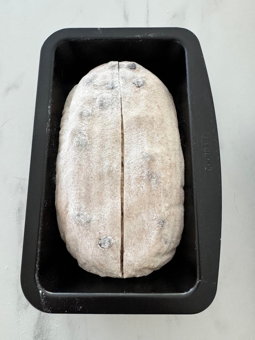 - Place the dough from the fridge into the loaf pan. Score. Spray a bit of water. Invert another loaf pan on top. Bake for 25min covered.