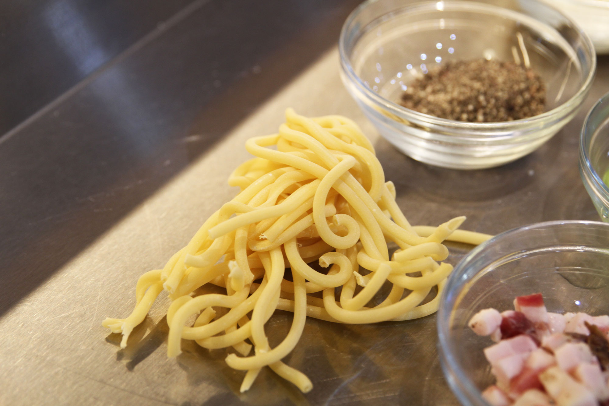Warning heeded, my attention is back on the task at hand. Parle brings out a tray of bucatini, which is made fresh every day at the restaurant.