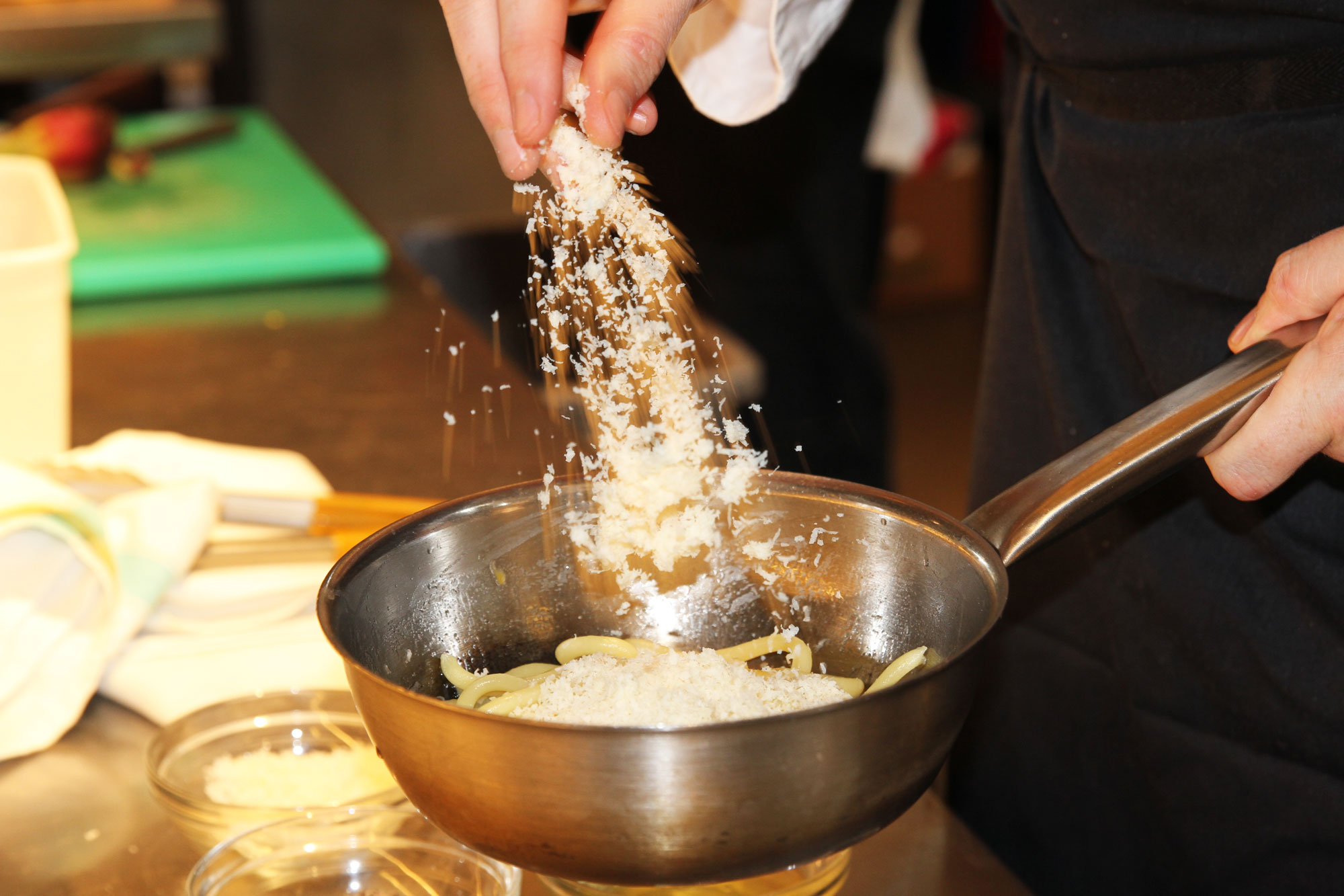 “Adding some pasta water is the difference between the dish being claggy and glossy,” adds Parle as he ladles some in.