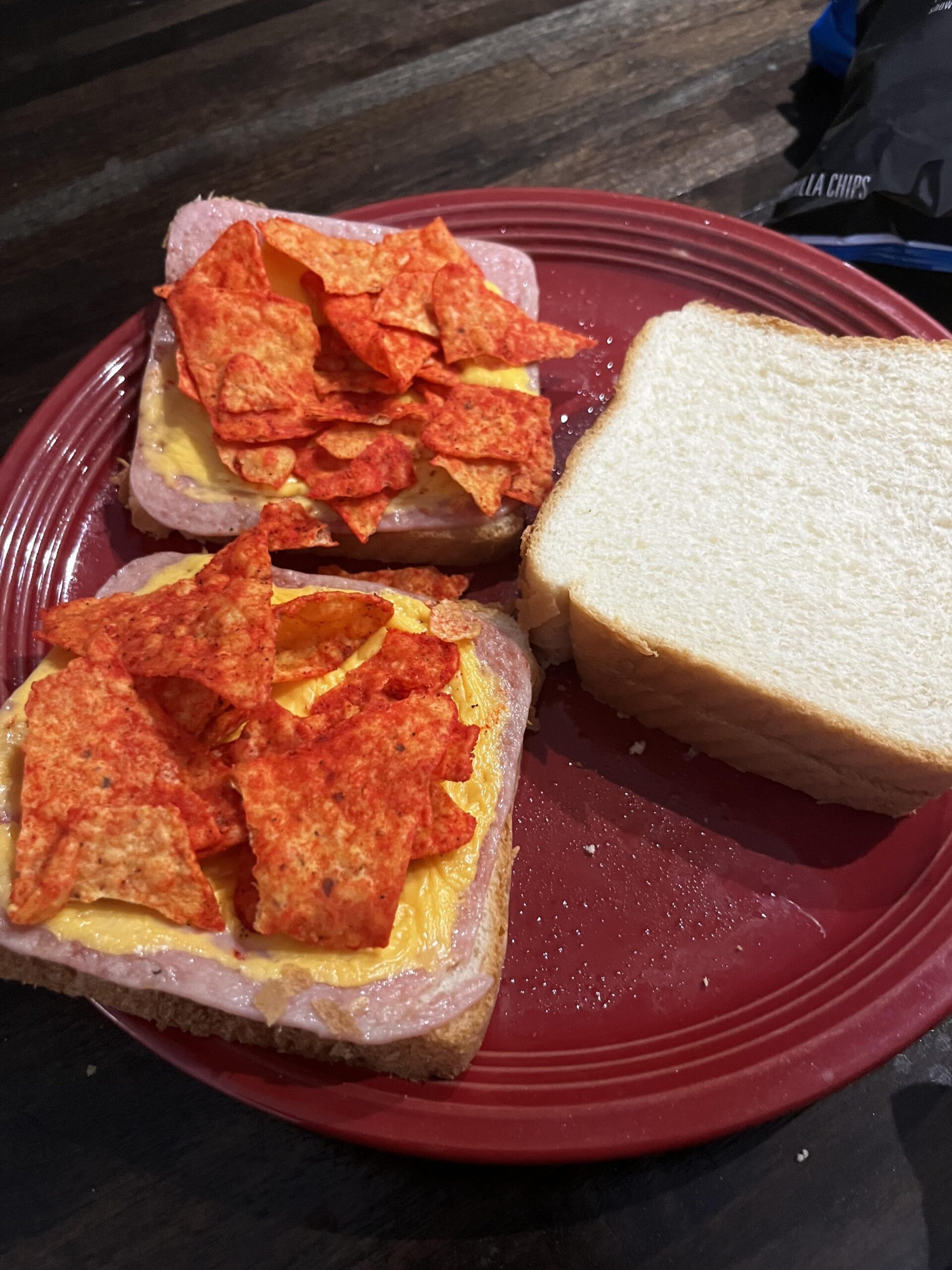 This is the sandwhich of my childhood. Just instead of putting a slice of melted cheese on top, you use the ham/cheese mix loaf with cheese doritos and mayo and mustard. Paired with an off brand Sams Cola and you’re in heaven.