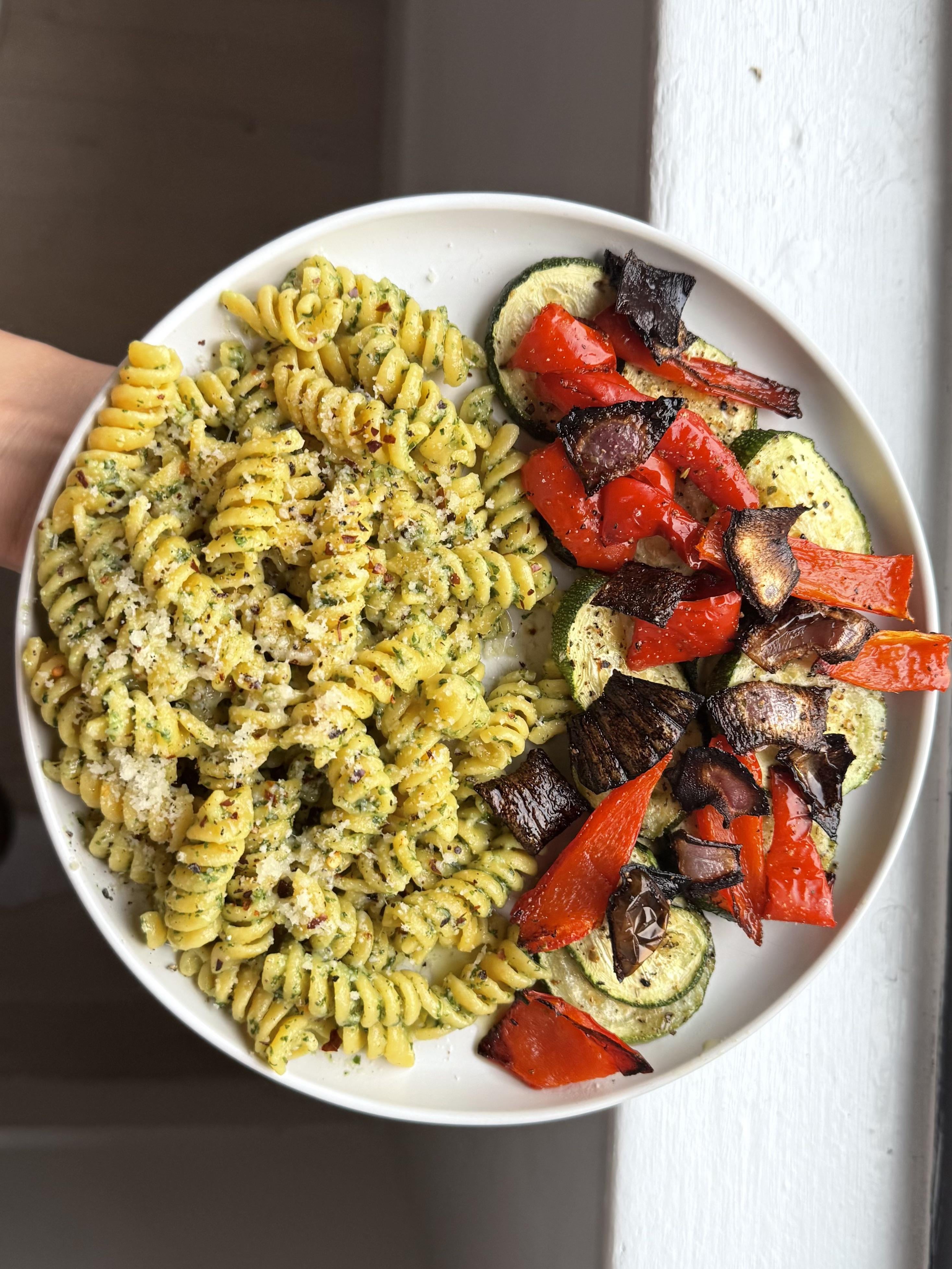 my basil plant needed a trim so i decided to make some pesto. everything came out 10/10. i used brami protein pasta which tastes 100x better than chickpea pasta.