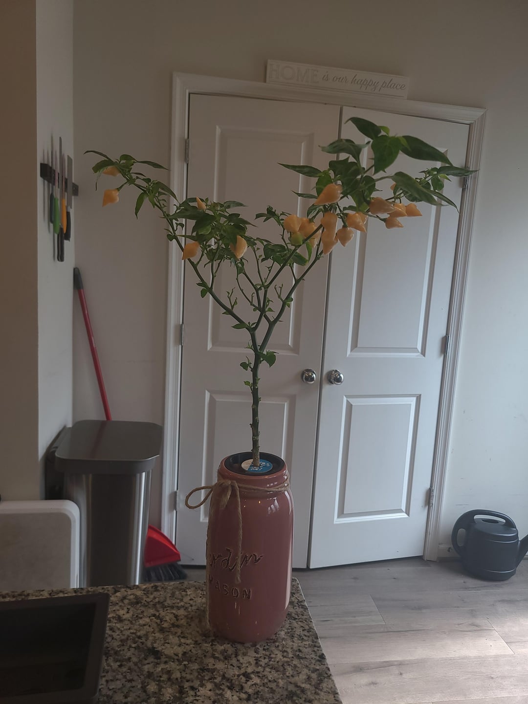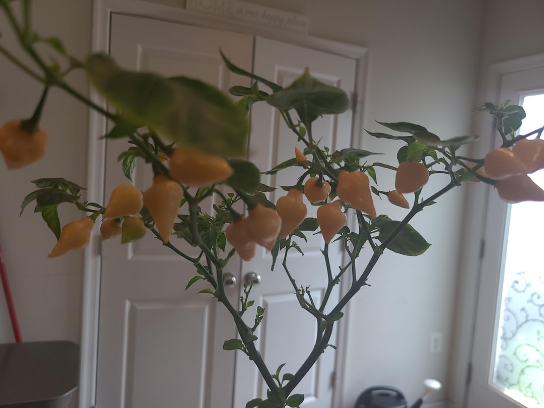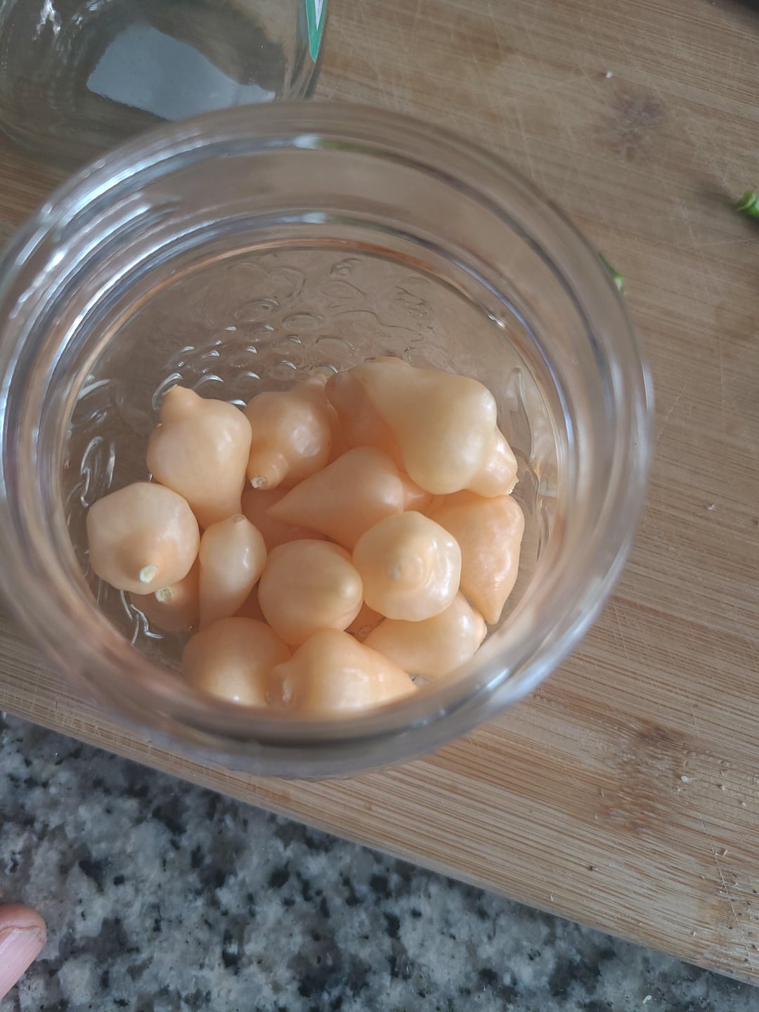 My peach biquinho peppers aka sweety drops.. Grown via kratky hydroponics in my kitchen. Pickled some and ate one this morning expecting the sweet barely spicy peppers you get at the Whole Foods olive bar. Holy sh!t !!!!!! I wont go as far to say it was habenero heat, but definatwly somewhere between a cayenne and thai chile. Caught me off guard and spit it out mid chew and ran to frisge for milk. LOL!