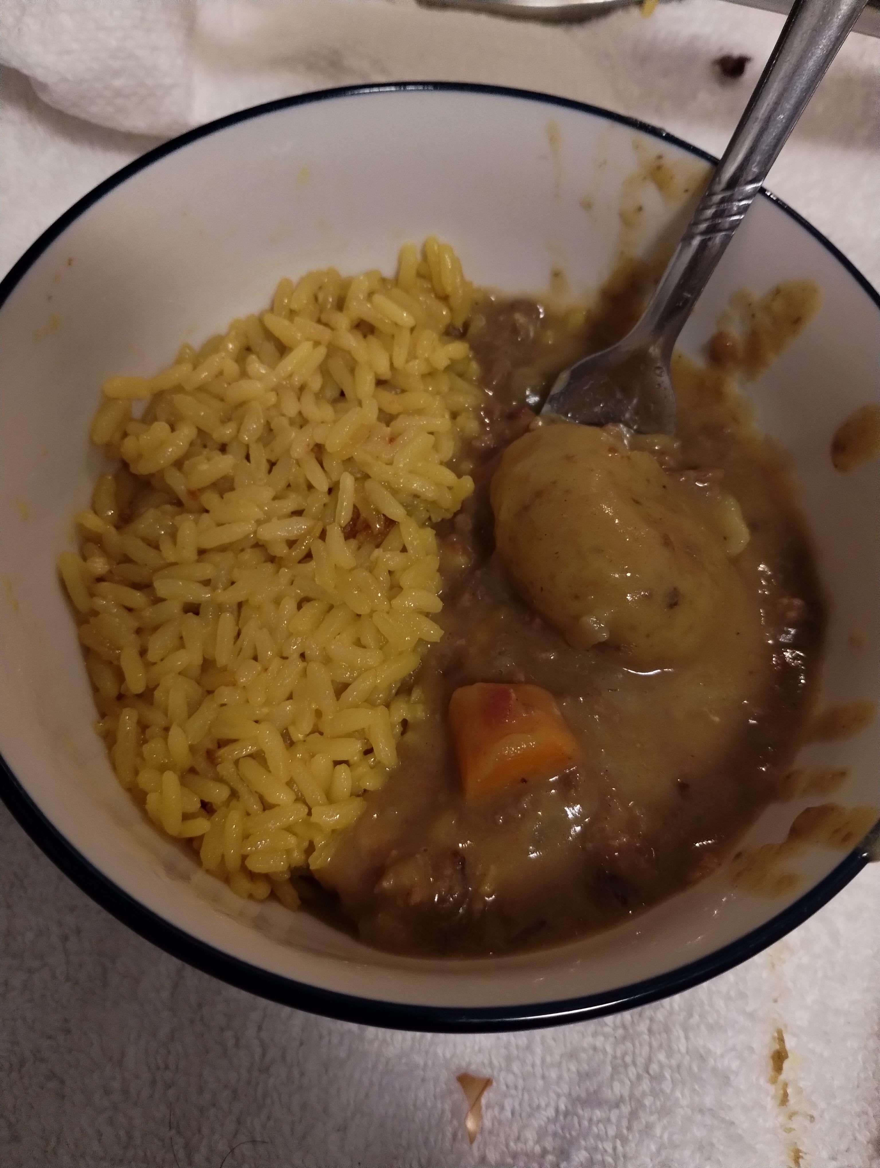 Japanese Golden curry cubes, baby gold potatoes, carrots, yellow onions, bacon bits, ground beef, peanut butter, and yellow Spanish rice (all I had, would have used white). Rum and Dr pepper and copious amounts of legal marijuana were harmed in the making/ eating of this meal.