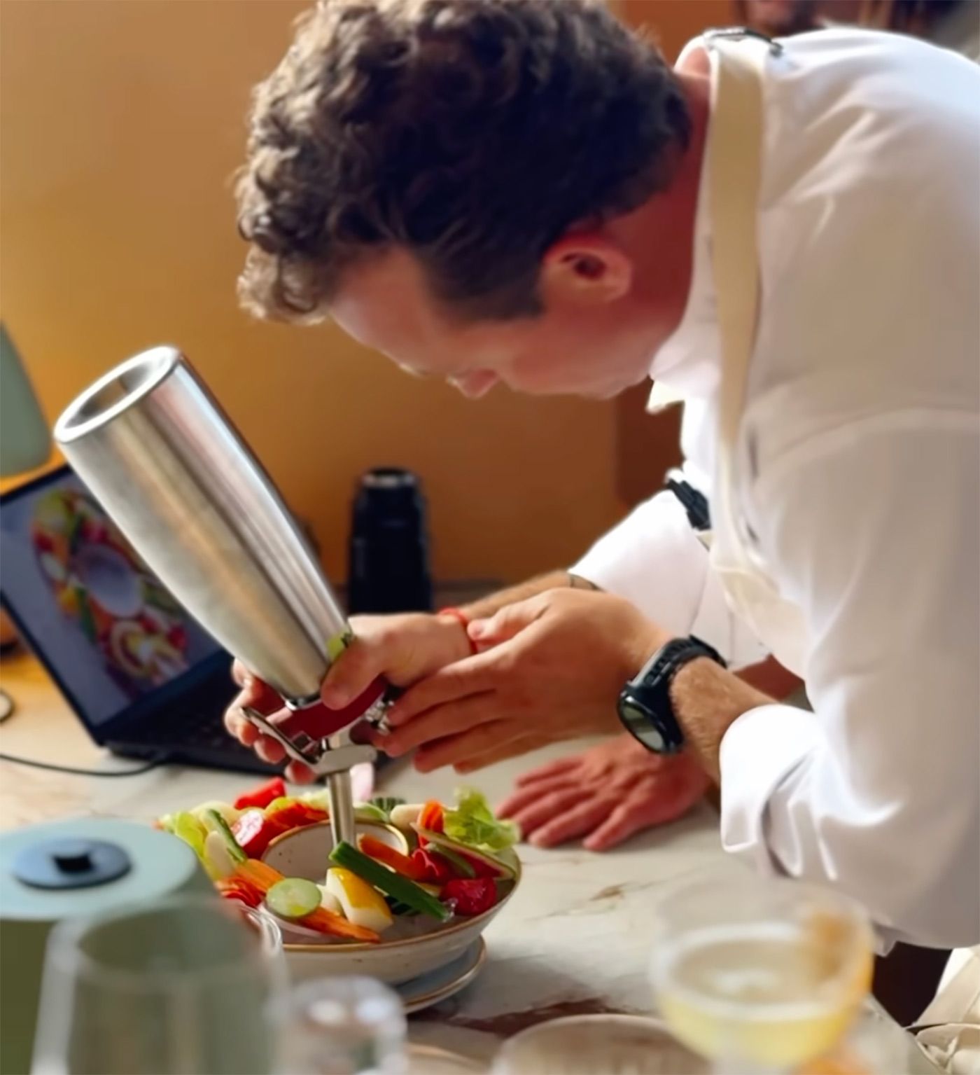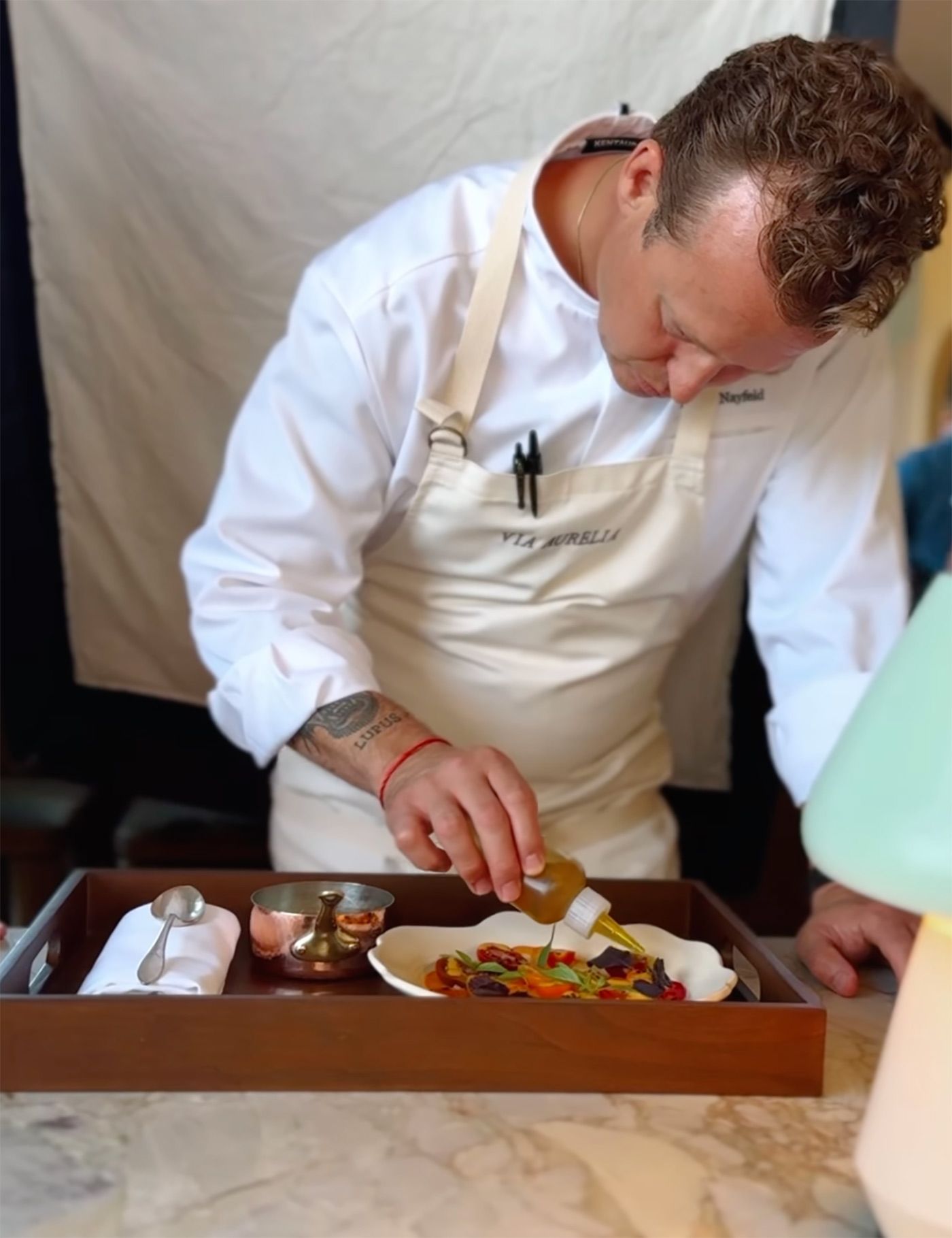 Nayfeld plating a tomato dish at Via Aurelia. Photo via Instagram