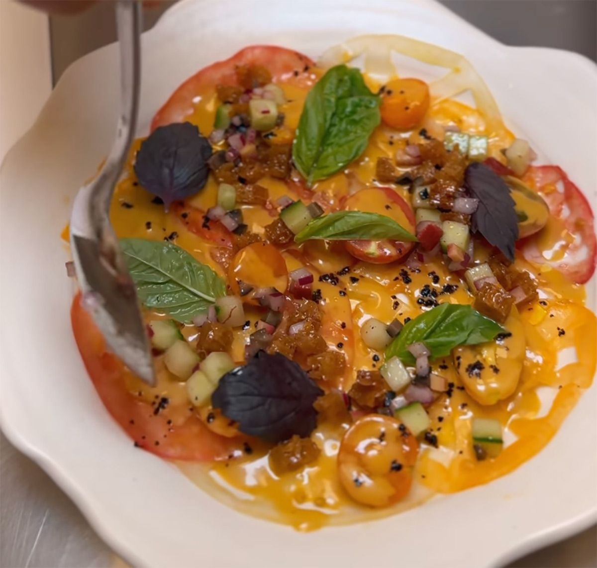 Nayfeld plating a tomato dish at Via Aurelia. Photo via Instagram That finished tomato dish. Photo via Instagram