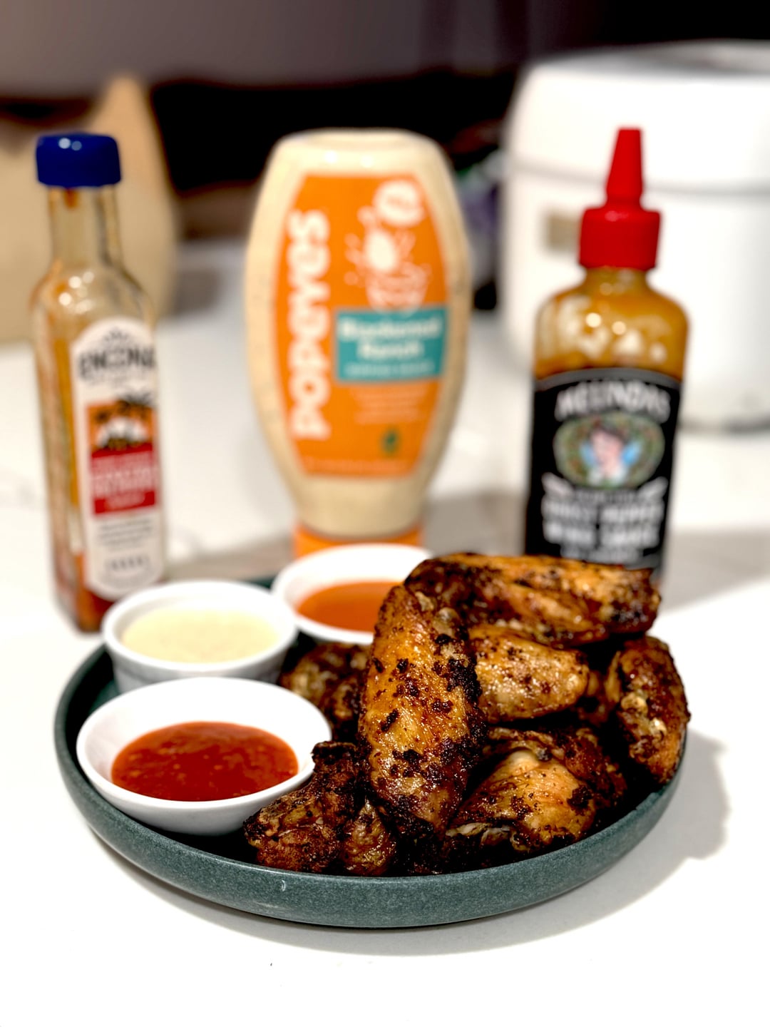 MELINDAS GHOST PEPPER WING SAUCE, ENCONA EXXXTRA HOT SAUCE AND POPEYES BLACKENED RANCH, WINGS WERE TOSSED IN EVOO, SHALLOT AND HERB SEASONING AND CAJUN SEASONING THEN AIR FRIED.by WHITEMERLOT69 Dining and Cooking